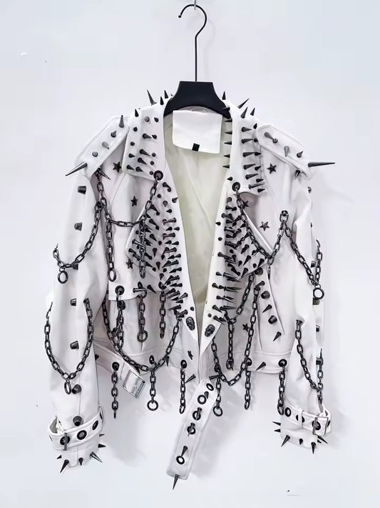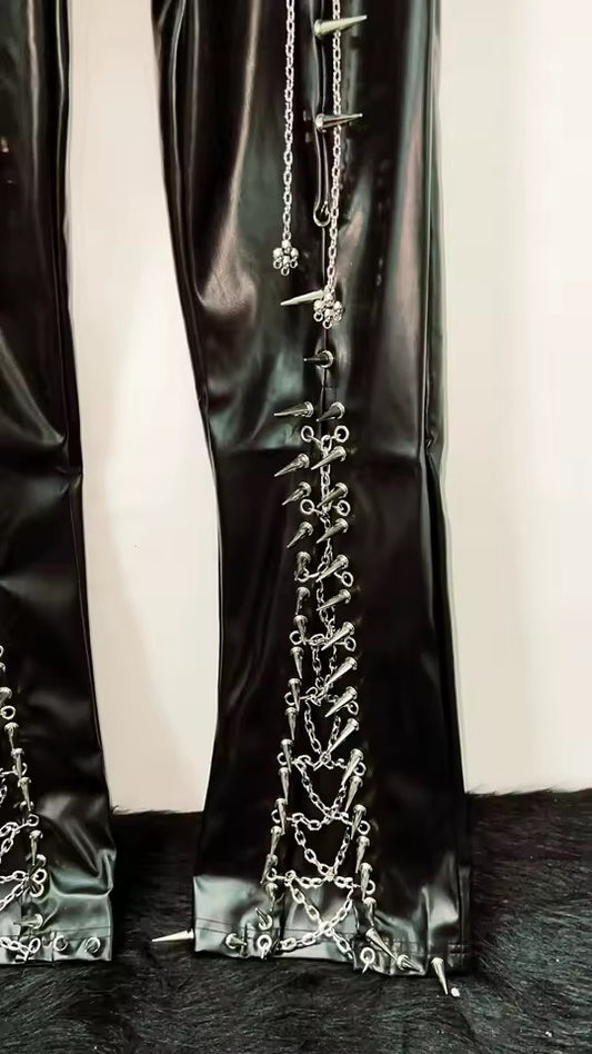 Black Faux Leather Flare Punk Chain Belt Spike Trousers