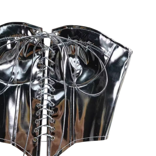 Silver Faux Leather Futuristic Lace Up Cropped Corset