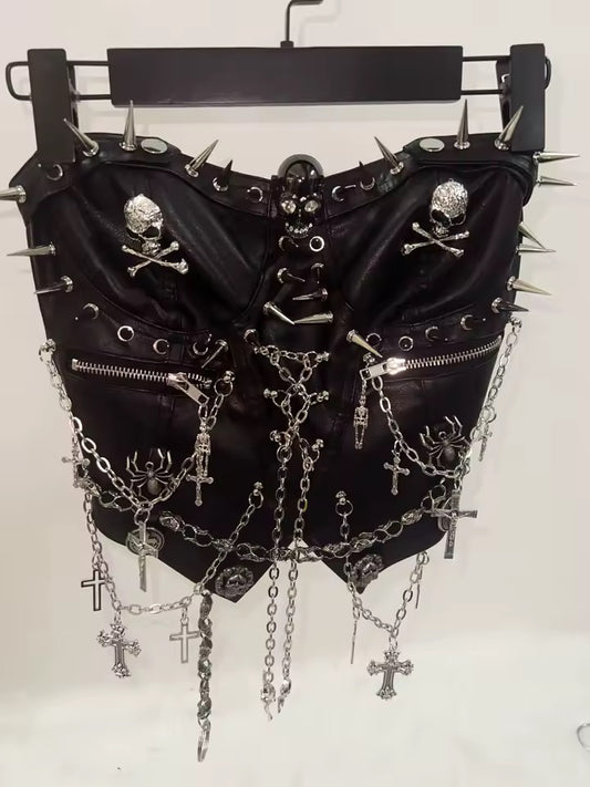 Black Punk Skull Charm Chain Strapless Utility Corset Top