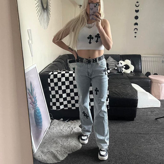 Blue Mid Waist Gothic Cross Patch Flare Jeans