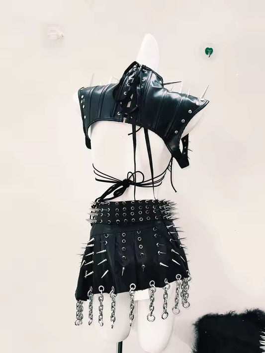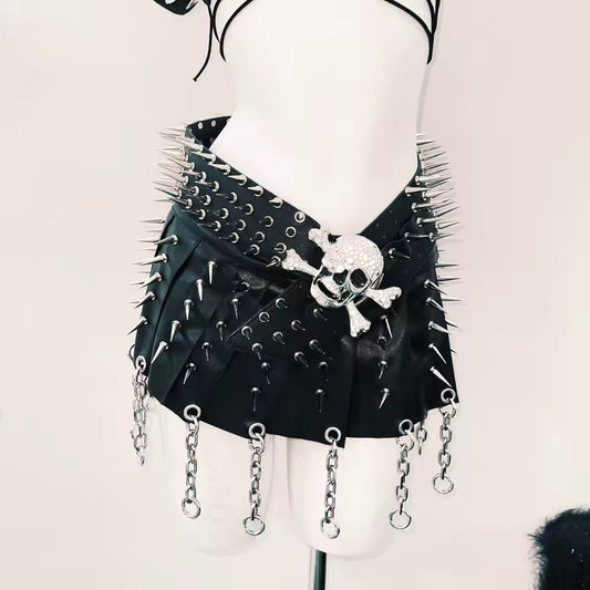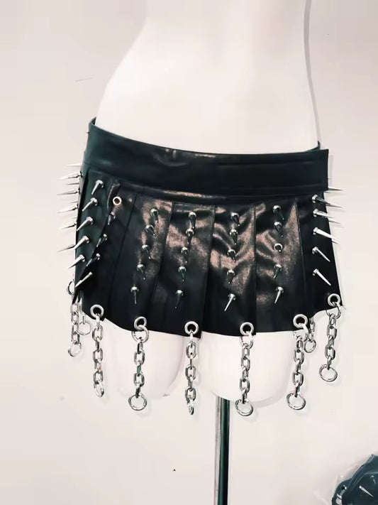 Black Faux Leather Punk Spike Chain Dungeon Mini Skirt