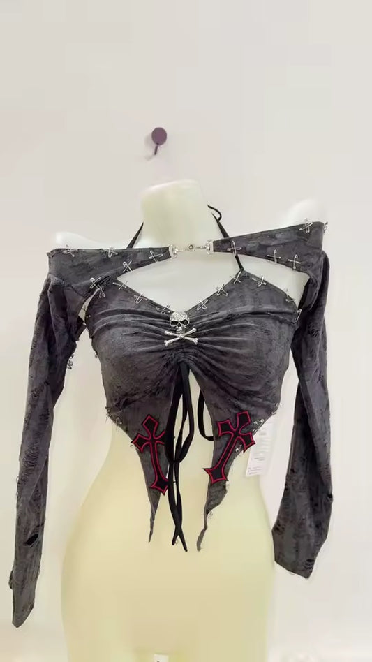 Grey Grunge Y2k 2 In 1 Crop Top Shrug Punk Set