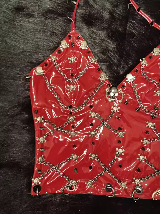 Red Faux Leather Punk Chain Skull Halter Crop Top