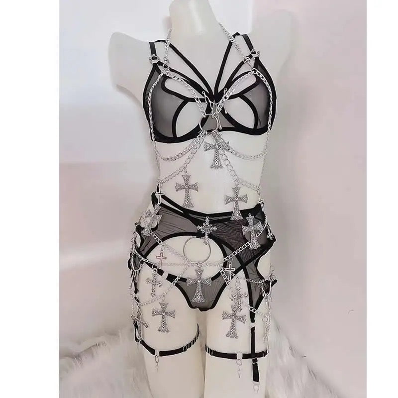 This Black 6 Piece Mesh Gothic Chain Lingerie Harness Set is perfect for special occasions. Its set includes a bra, chain chest harness, garter belt, pair of garters, panties, and chain belt. The set features gothic cross pendants on the chains and hook and eye fastening on the bra. Look your best with this chic lingerie set.