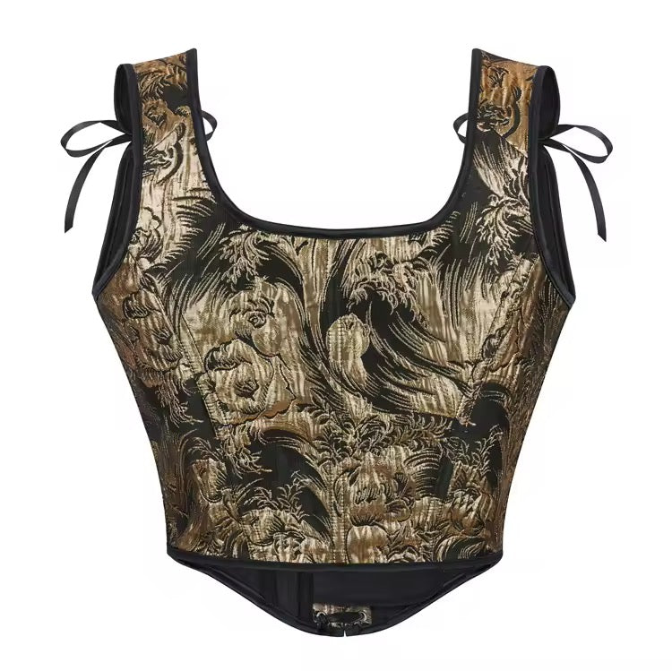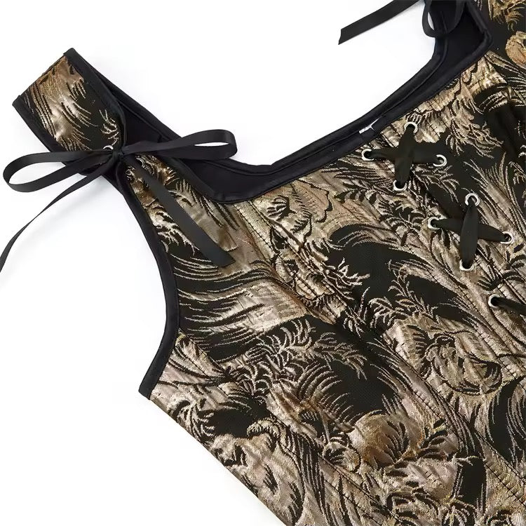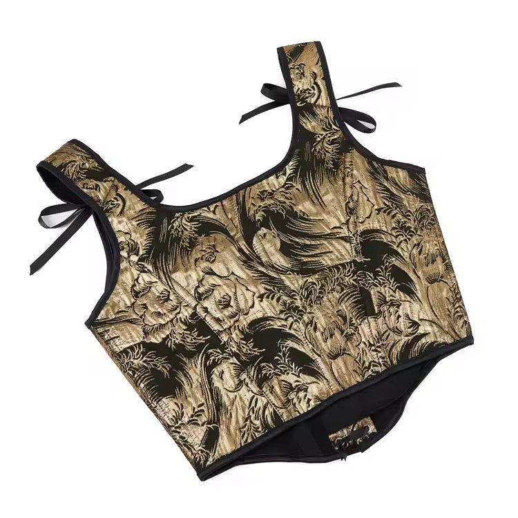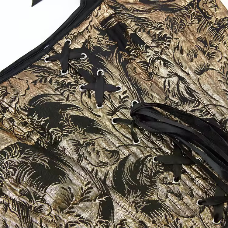 This gothic-inspired cropped corset top is a dream come true. Made from thick, structured fabric, it provides perfect shape and support. The lace-up ribbon front not only adds a unique touch, but creates a flattering push-up effect that is adjustable for a perfect fit. The black and gold floral print adds an avant-garde feel to complete the look. Refer to the size guide for the perfect fit.