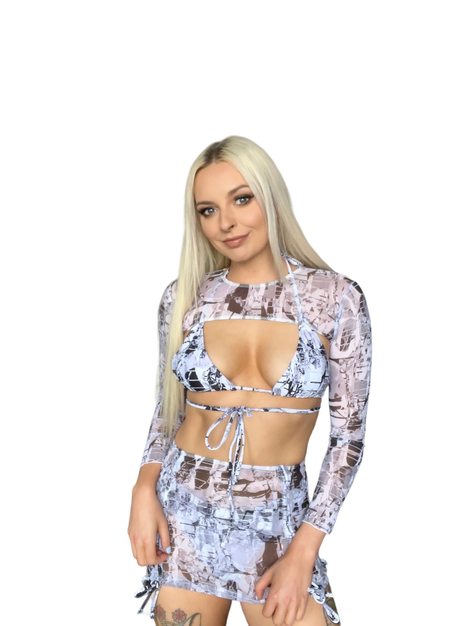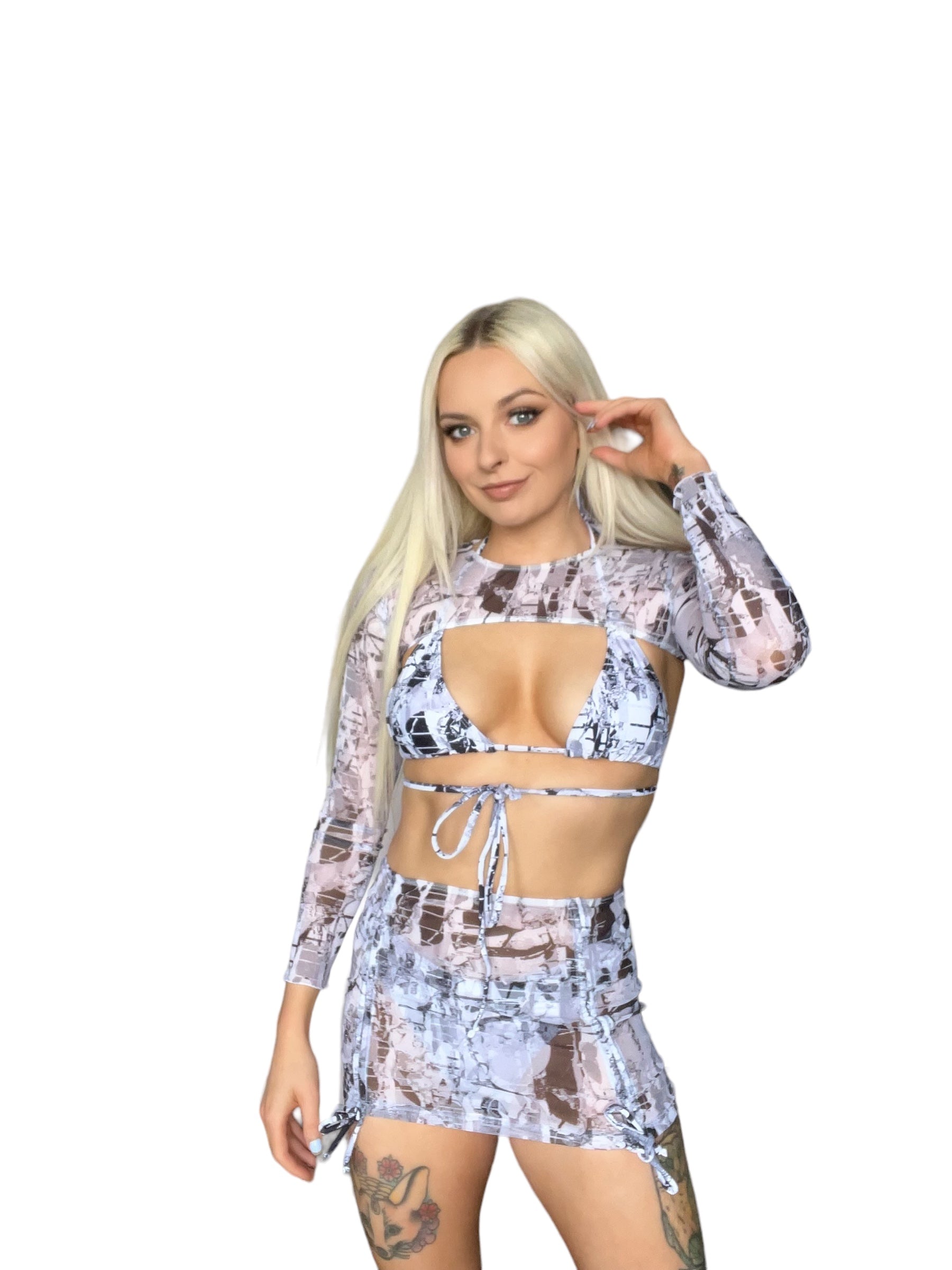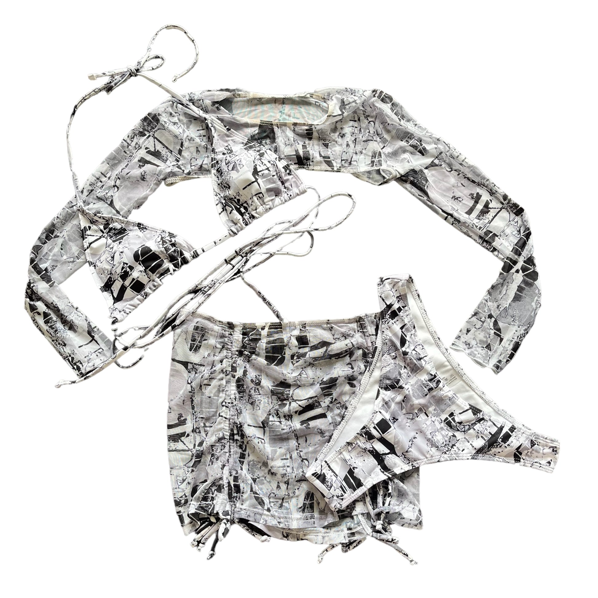 This chic, four-piece bikini set is perfect for any fashionista's summer wardrobe. Featuring a black and white abstract pattern, the set includes a bikini, mesh crop top and mesh skirt to keep you looking cool and stylish. Perfect for a beach day or pool party, this set will keep you comfy and stylish all summer long.