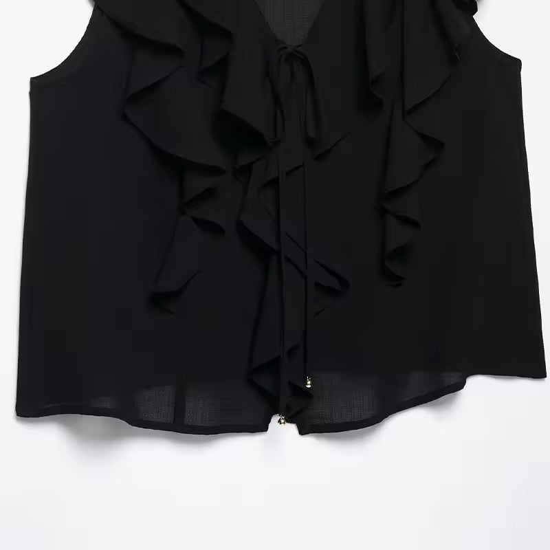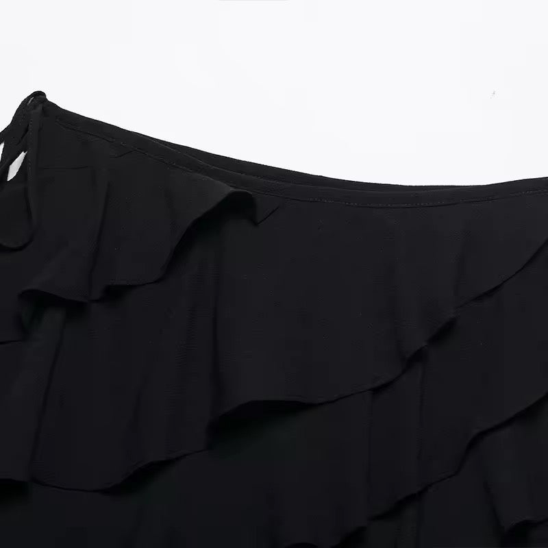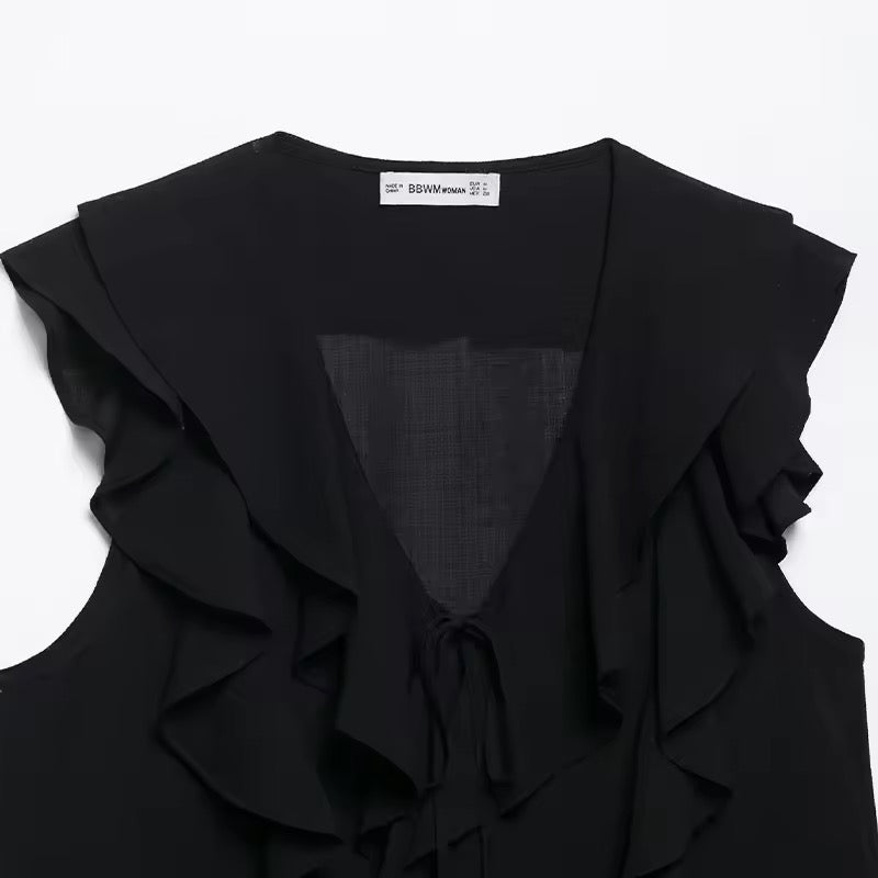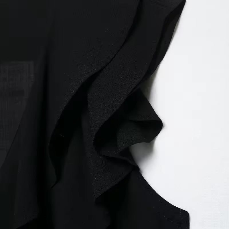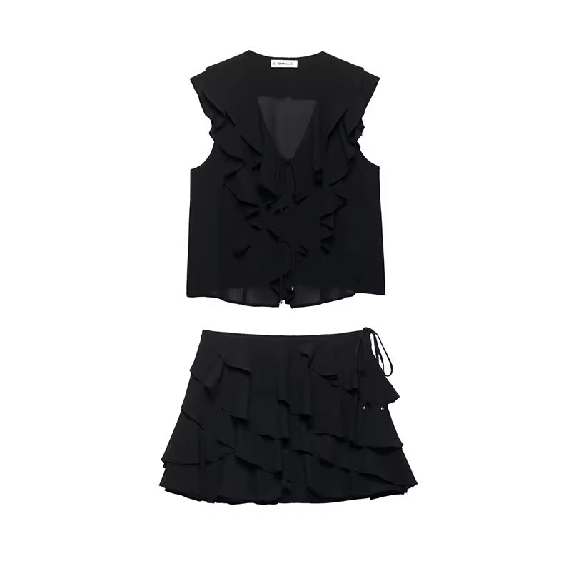 This 2 piece set features a sheer chiffon vest and a mini skirt, perfect for both work and a night out. The ruffle design adds a touch of flowy romance to the soft fabric. Make a bold statement in this Black Dark Romance set.