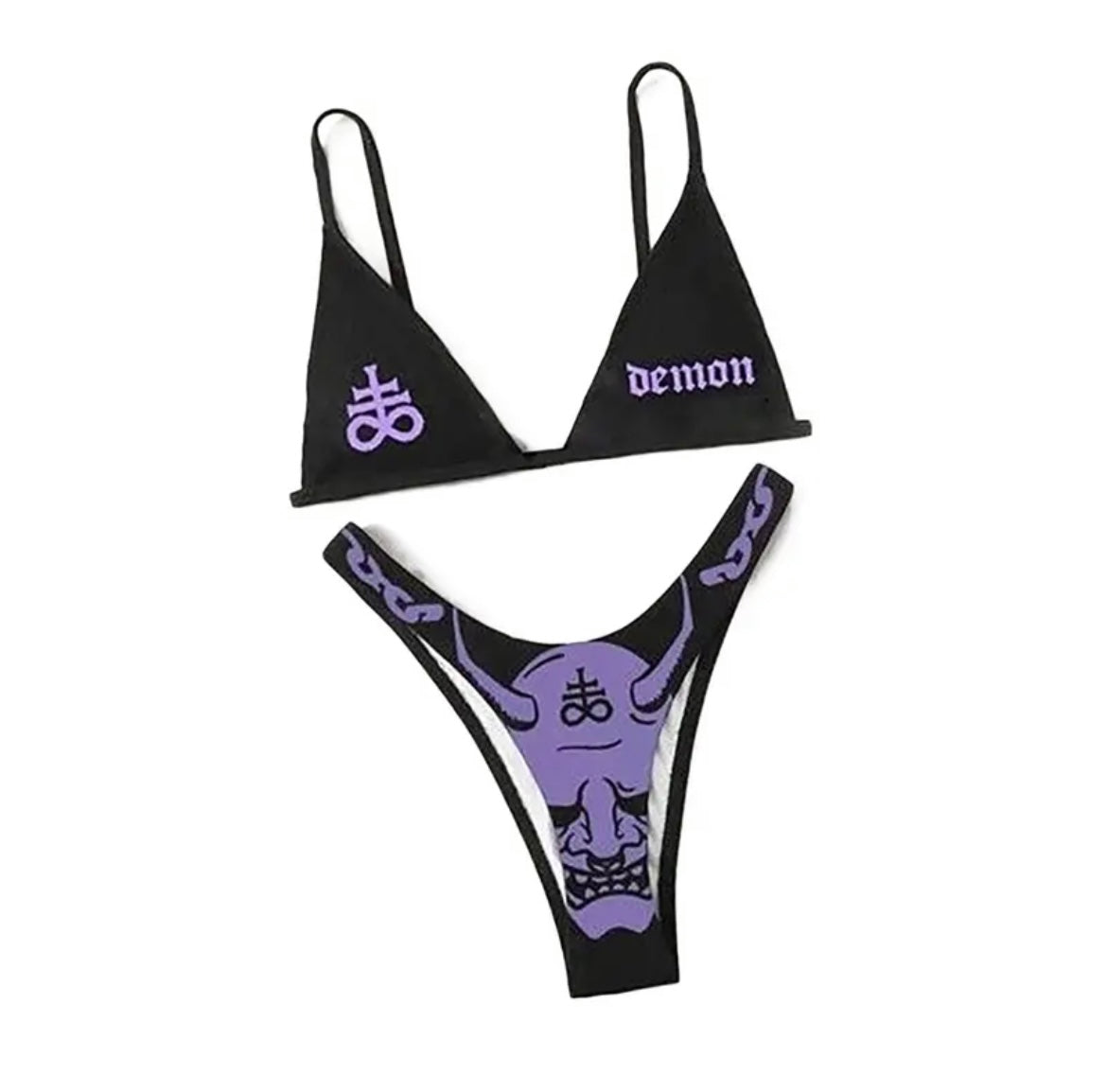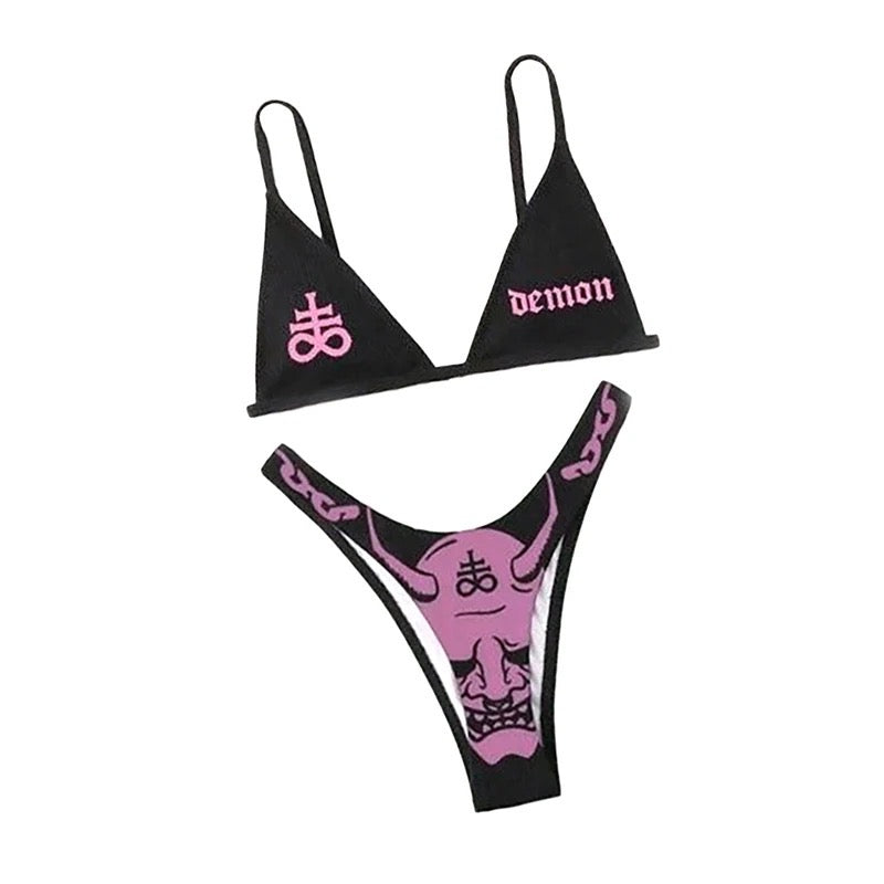 Be devilishly cute in this Black Demon 2 Piece Gothic Bikini Set! Featuring an edgy demon design, this set is sure to make an impression—whether you're lounging at the beach or conjuring up a storm at a festival.