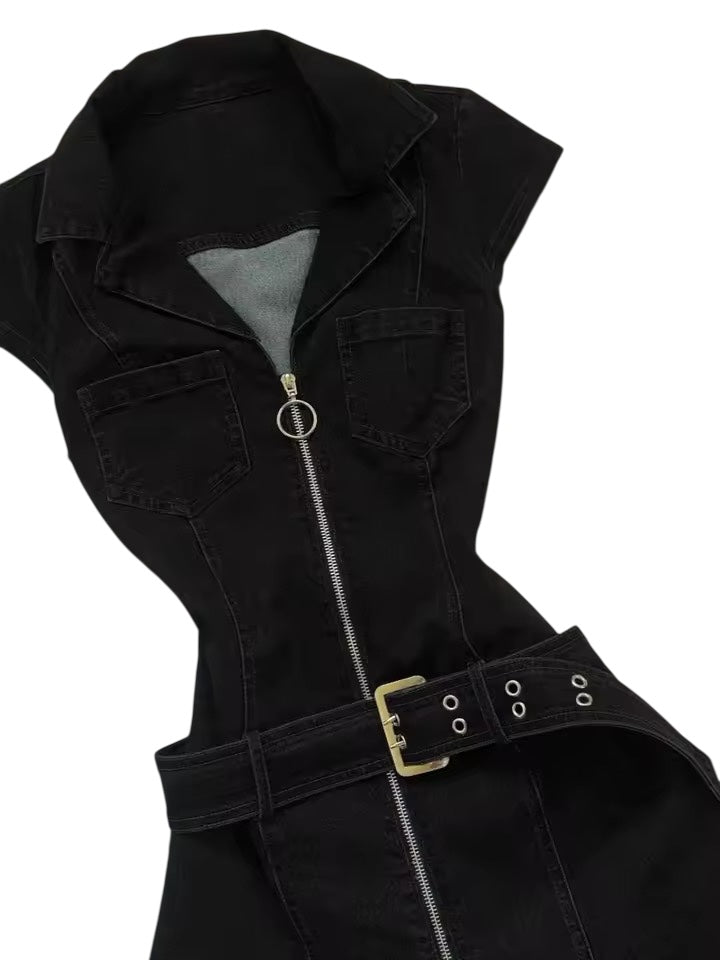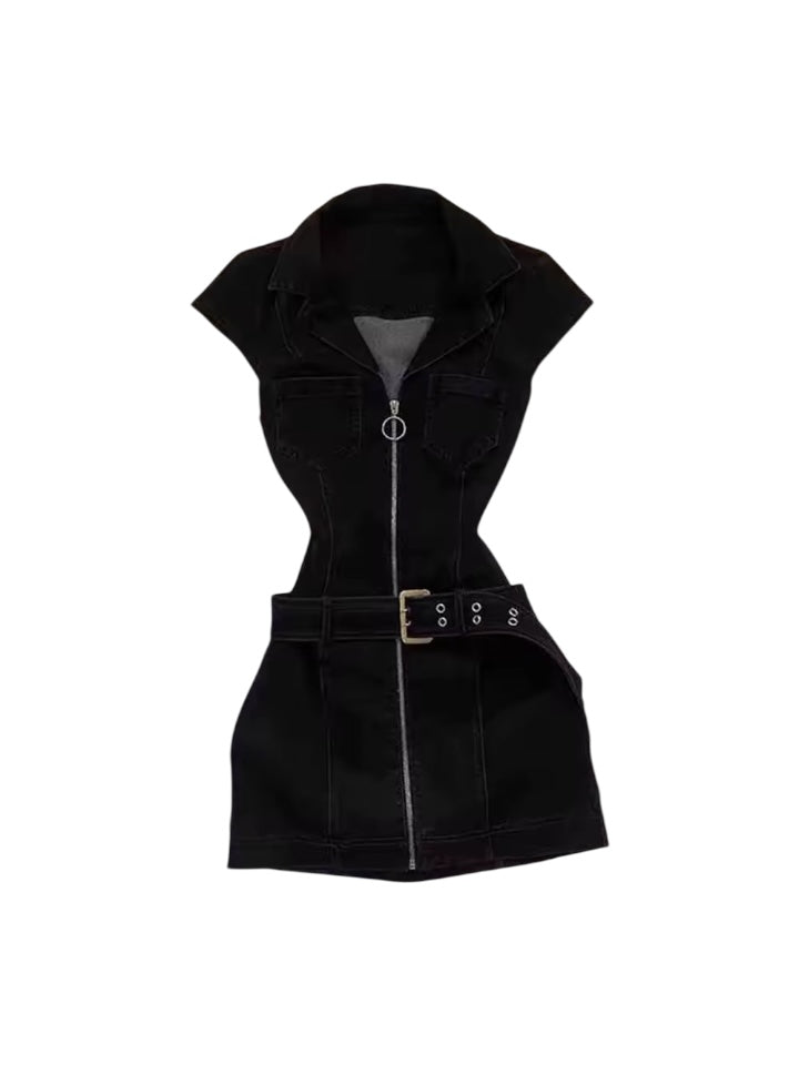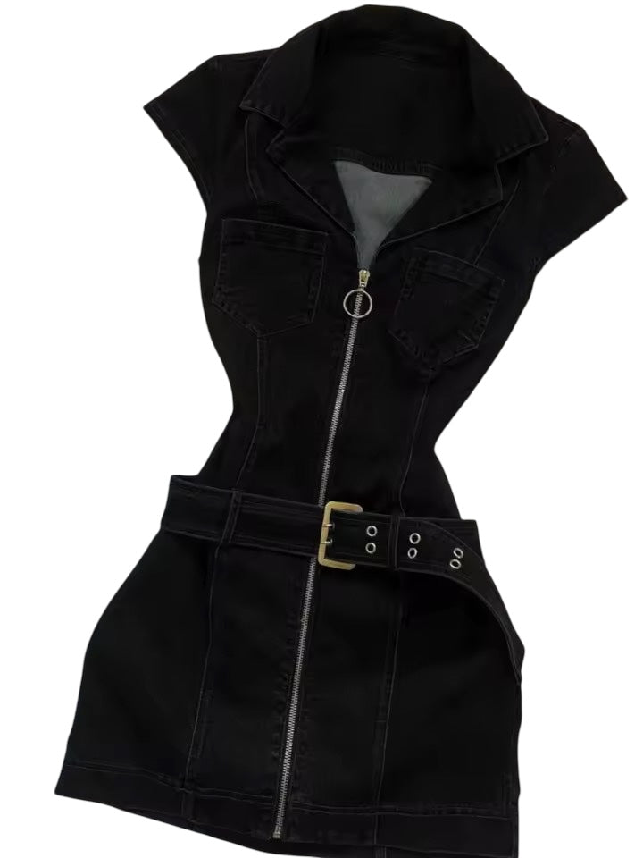 Expertly crafted from high-quality denim, our Black Y2k Belt Mini Minimalist Dress is the perfect addition to any wardrobe. With an exposed zip fastening in the front, this mini length dress exudes sophistication and style. The Y2k design and included belt add the perfect touch of modern flair. Transition seamlessly into any season with this versatile piece.