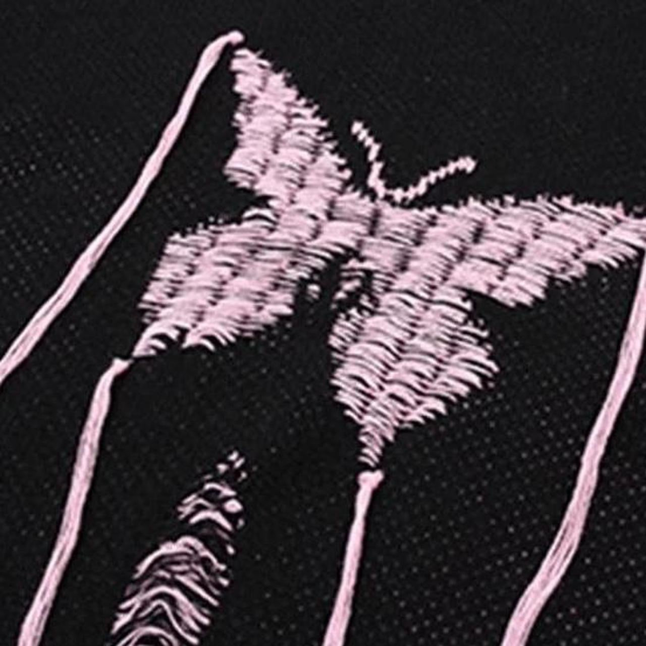 This unique oversized knit is perfect for expressing your true style. The Black Distressed Grunge Butterfly Jumper has a pink butterfly knit with tassels, bringing the grunge aesthetic of the '90s into a modern look. Wear it as a jumper or a dress for a truly versatile look.