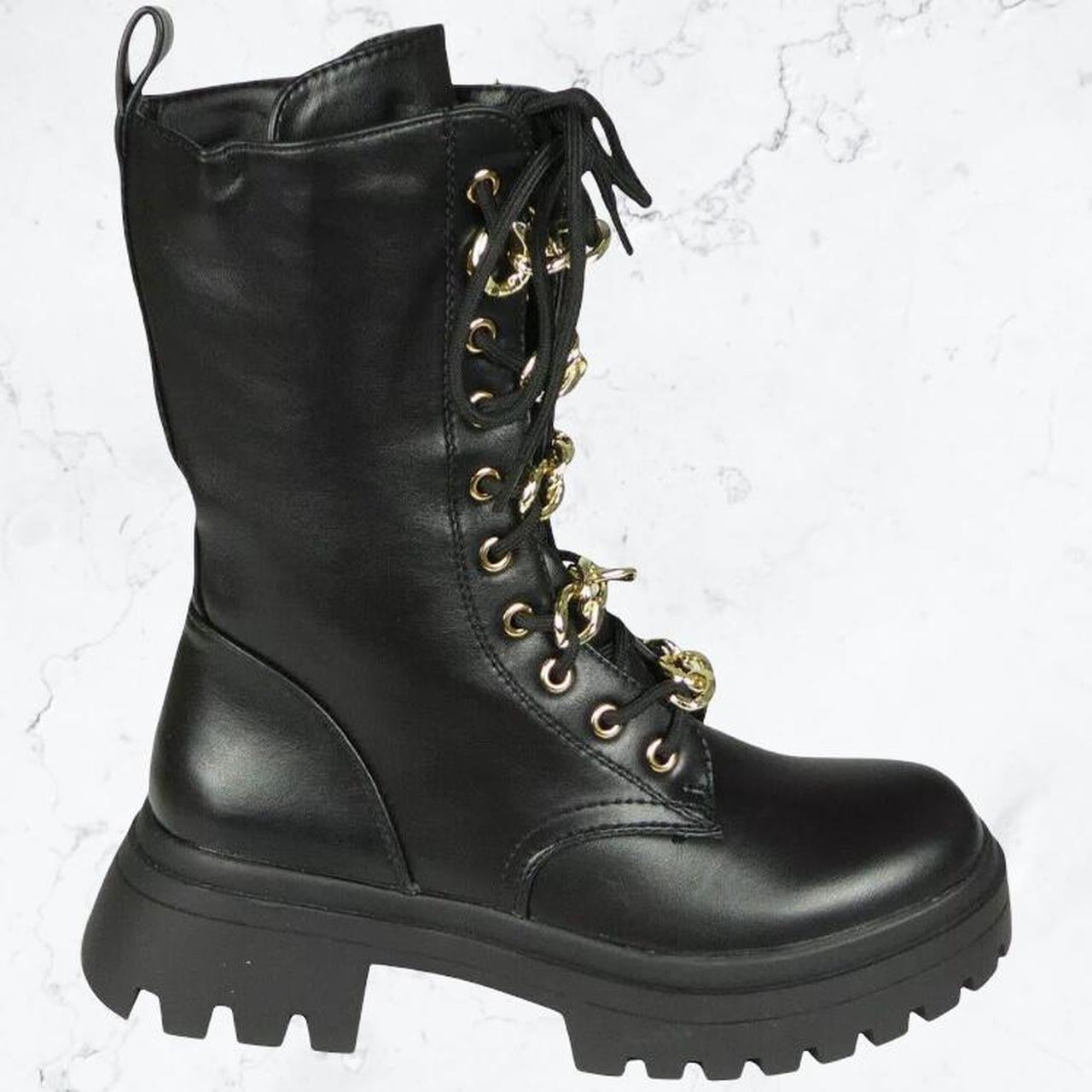 Black Faux Leather Chain Lace Up Punk Combat Boots