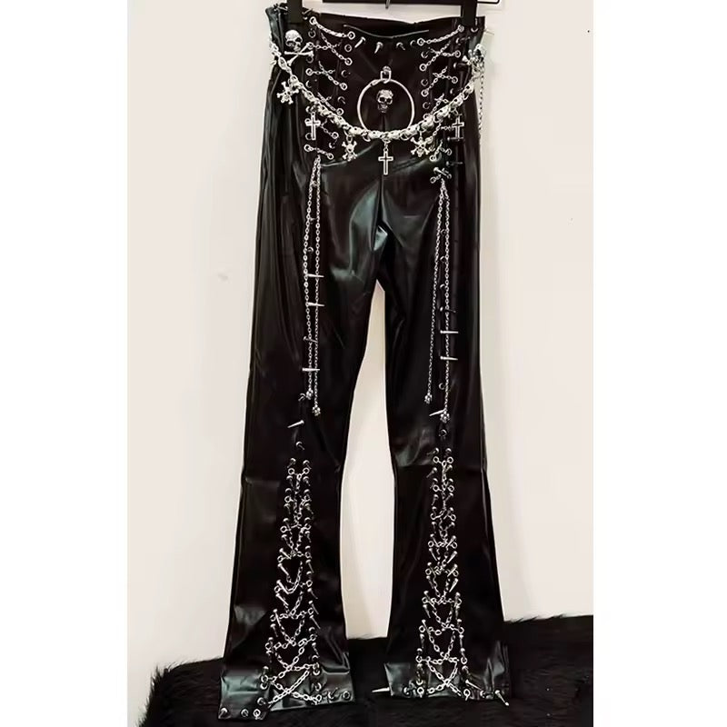 Expertly crafted with stretchy faux leather fabric, these trousers feature lace-up chain detailing, silver spike studs, and gothic cross and skull charm pendants. The size guide in the images ensures a perfect fit. Embrace a bold and edgy style with these flare punk chain belt trousers.