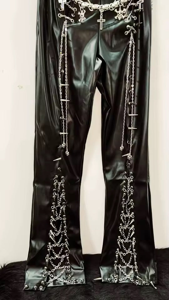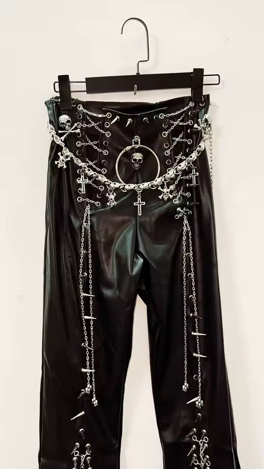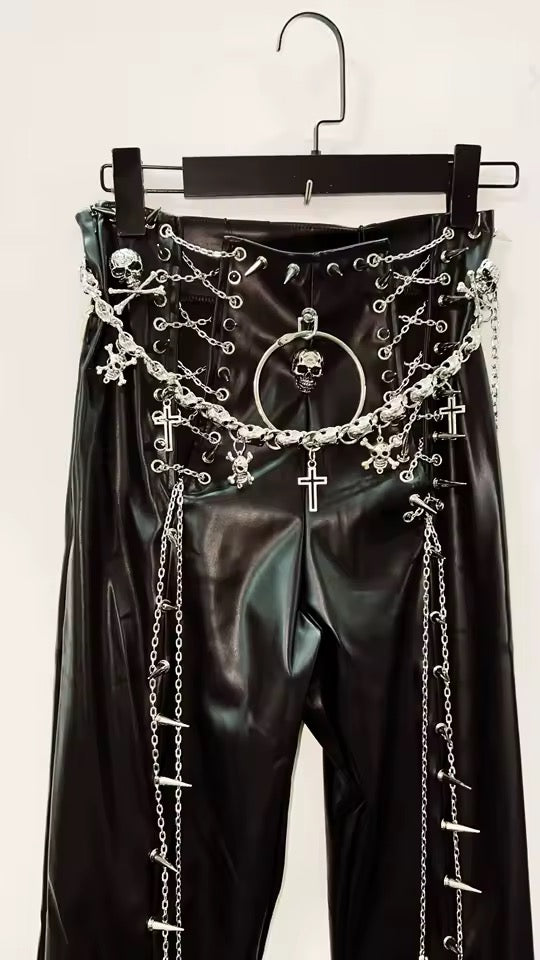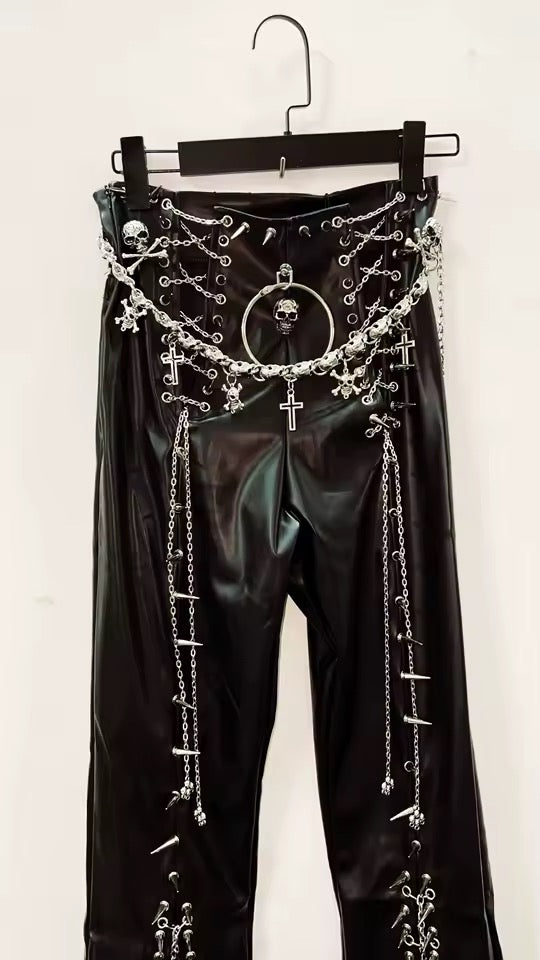 Black Faux Leather Flare Punk Chain Belt Spike Trousers