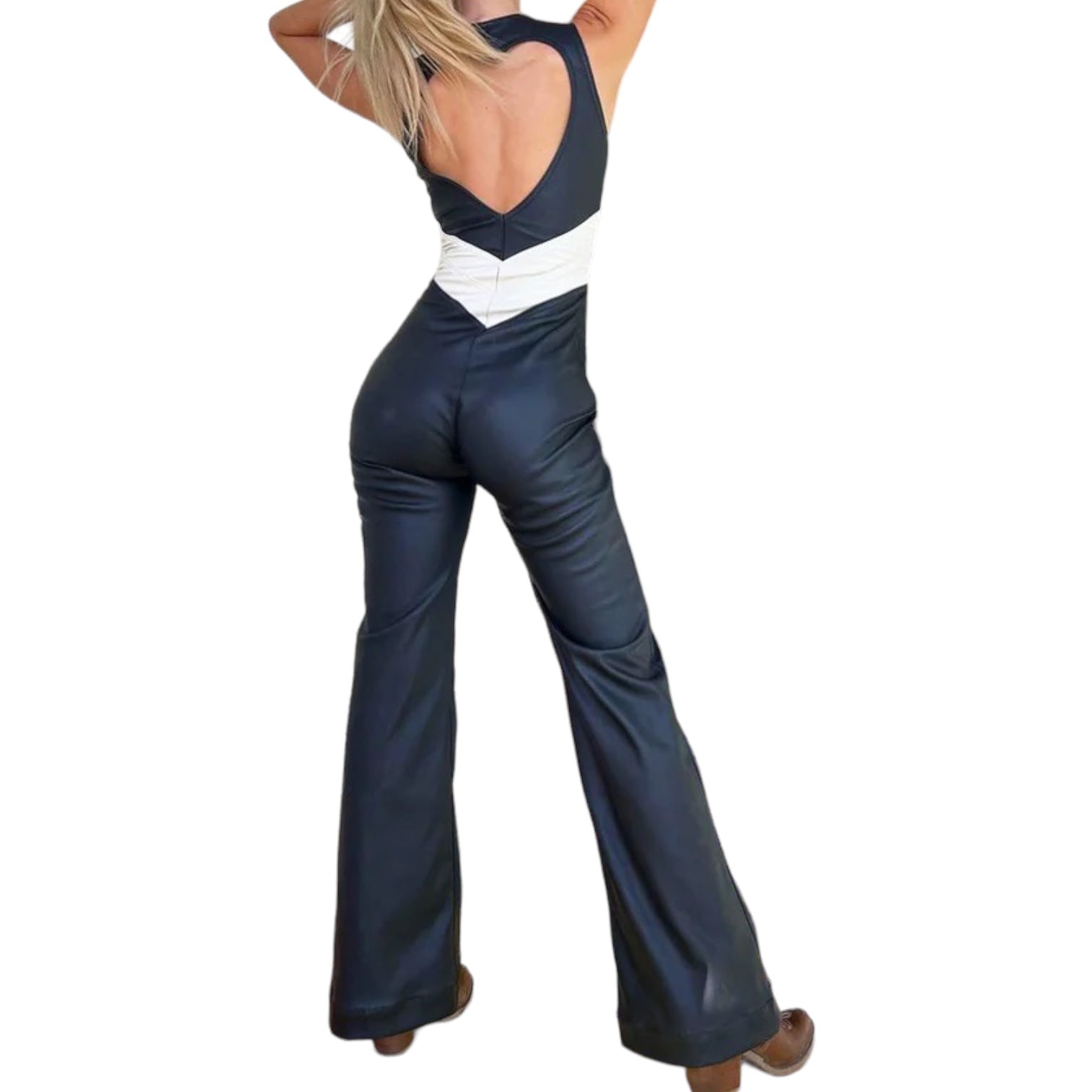 Black Faux Leather Heart Backless Motocross Jumpsuit