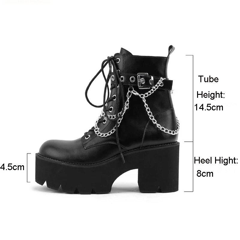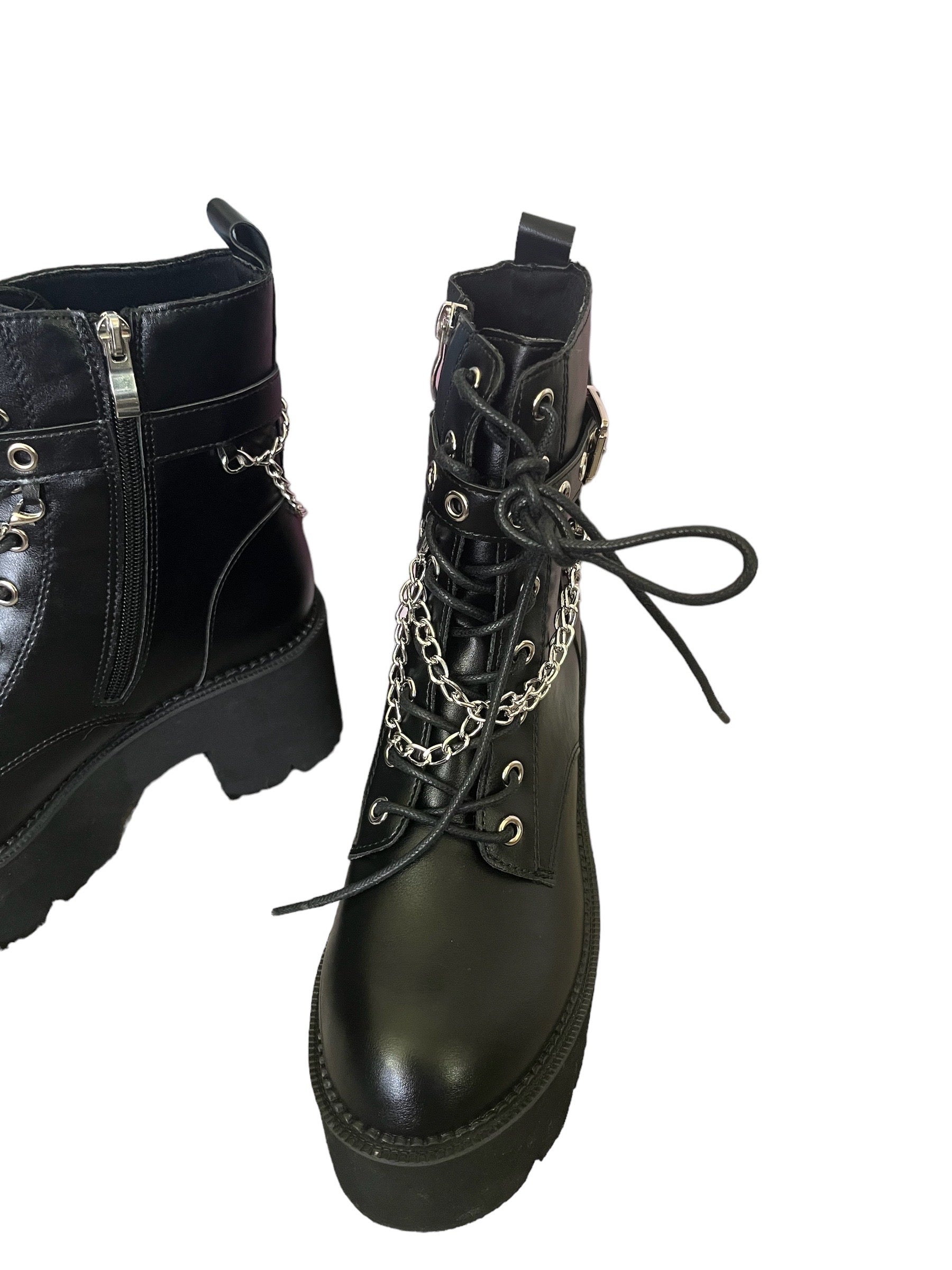 These Black Faux Leather Platform Chain Heel Boots combine style and comfort for a fashionable look. They are designed with a lace up front and a zip fastening at the side, as well as buckles and silver chain embellishments. Enjoy comfort and stability with the chunky platform heel.