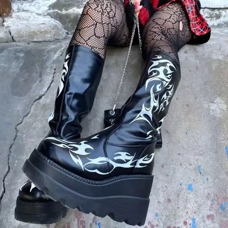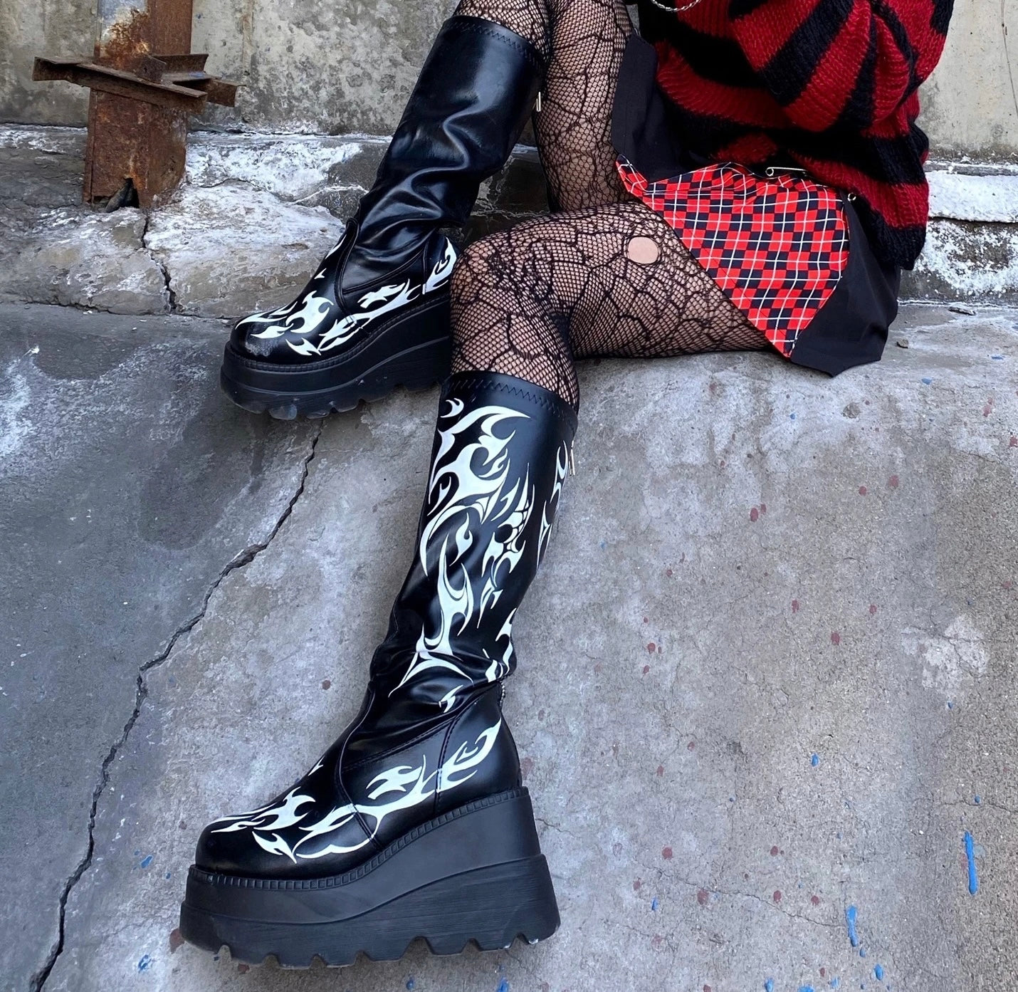 These Black Faux Leather Punk Flame Platform Knee Boots will make a bold statement. The sleek black faux leather exterior is decorated with an eye-catching white punk flame print, ensuring you stand out from the crowd. With a platform heel, these boots are stylish and comfortable.