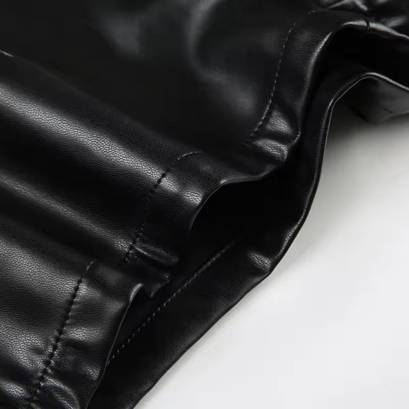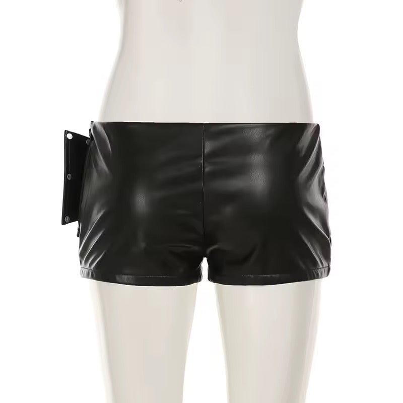 These Black Faux Leather Punk Low Rise Shorts are designed for comfort and style, featuring a stretch fabric that allows for ease of movement. The secure zip fastening and prominent buckle design enhance the aesthetic while providing a modern Y2K punk vibe, making them suitable for various casual occasions.