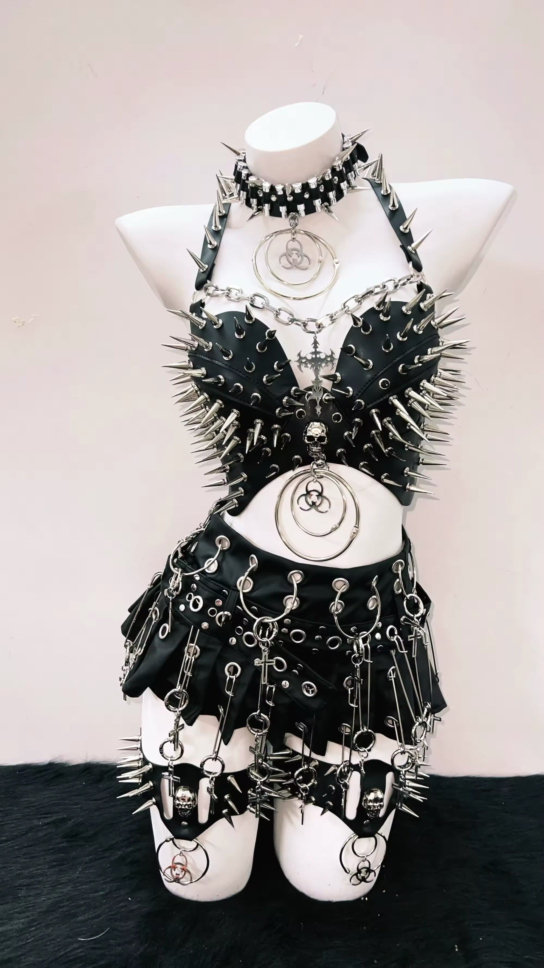Add some edgy style to your wardrobe with our Black Faux Leather Punk Spike Chain Crop Top. Made with faux leather and silver spike studs, this top also comes with a punk choker and O ring hardware with chain gothic pendants. Get the matching skirt for a complete, fierce look.