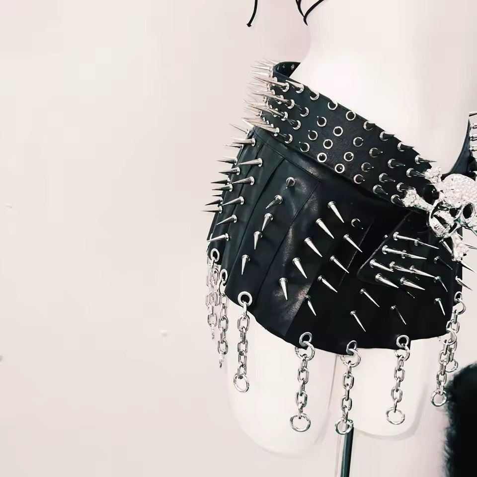 Black Faux Leather Punk Spike Chain Dungeon Mini Skirt