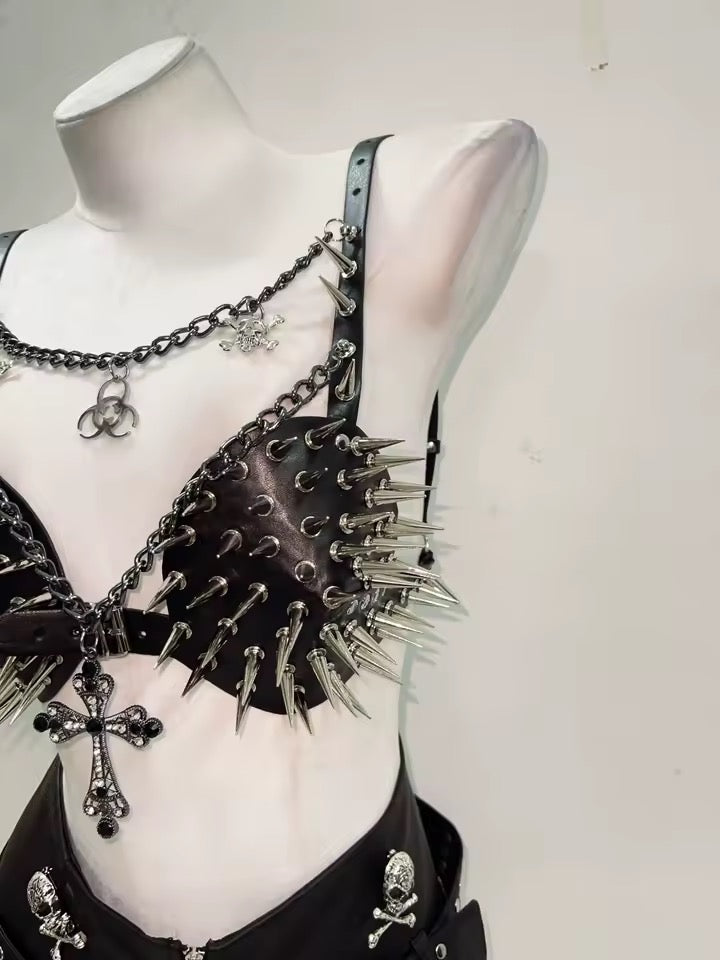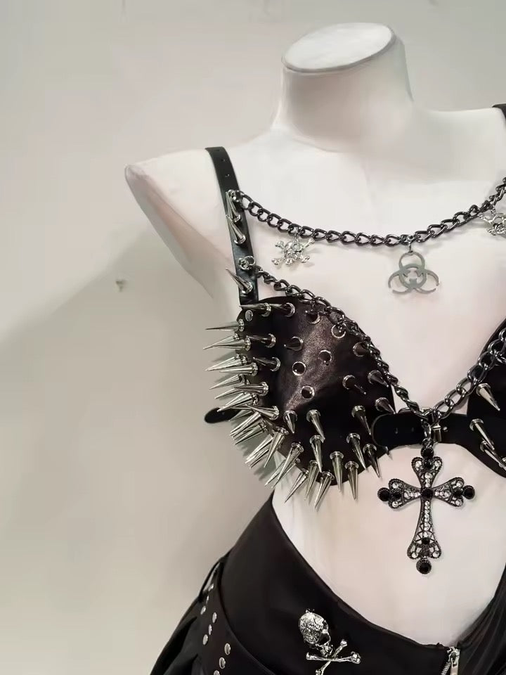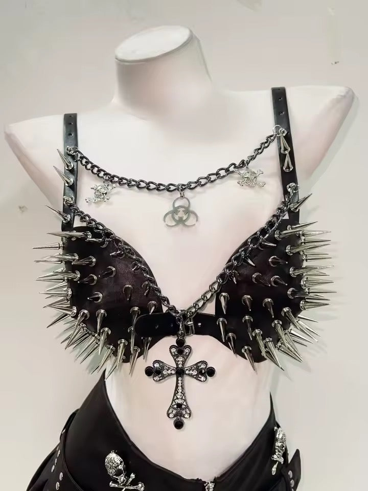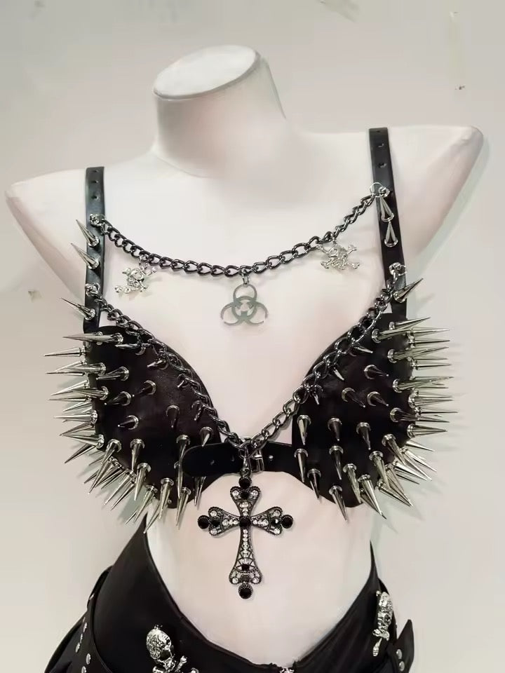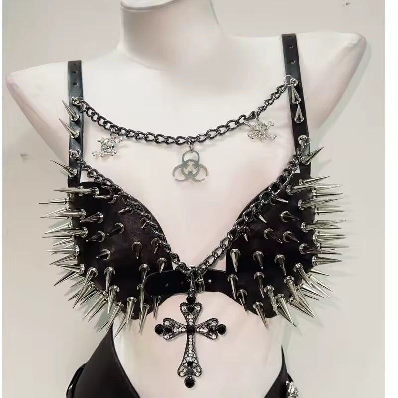 Experience edgy fashion with our Black Faux Leather Spike Punk Chain Bra. Made with faux leather and featuring a unique chain strap with gothic pendants, silver spike studs on the cups, and a cross pendant. With a buckle fastening, this bra is adjustable for a perfect fit. Take your style to the next level with this daring piece.