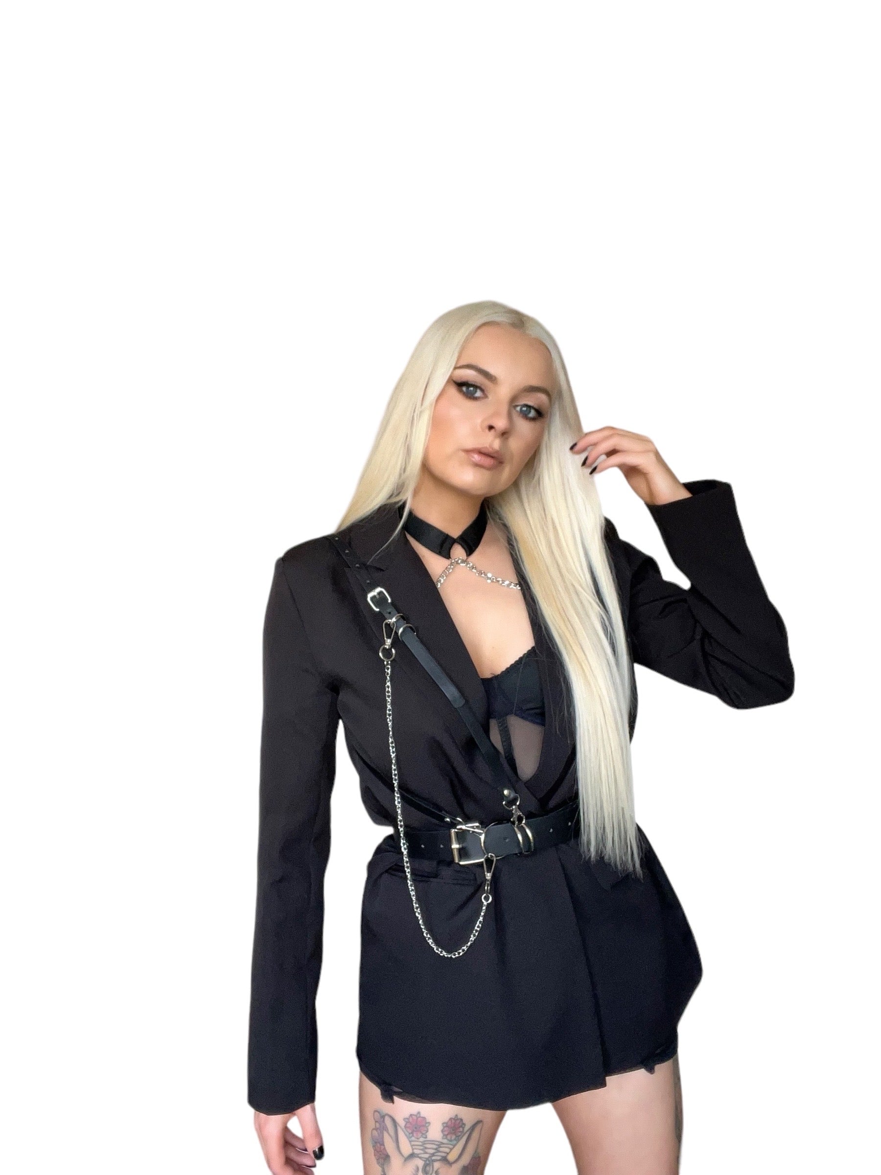 This black faux leather waist belt chain harness securely fastens around the waist and shoulders for a classic look. The detachable silver chain adds a chic, stylish touch to any outfit. Get ready to take the streets in this statement-making piece.