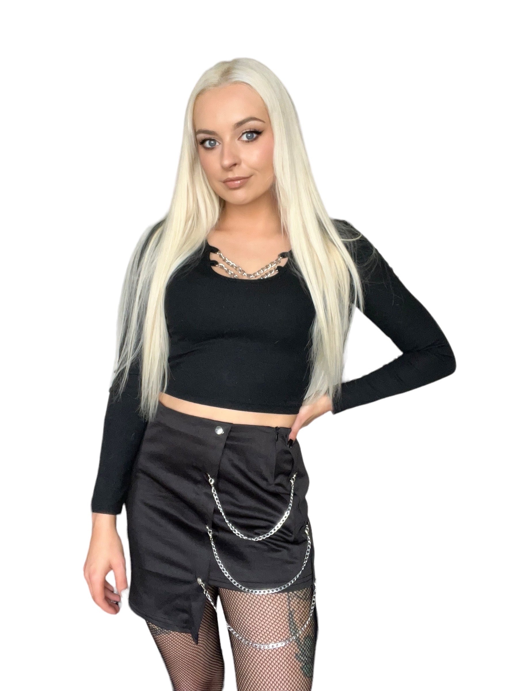 Stay on trend with this black gothic mini-skirt. Featuring a zip fastening and 3 silver-tone chain details, this skirt is perfect for giving any outfit an edge. Can wear casually or easily dress up, must have staple for your wardrobe as completely timeless