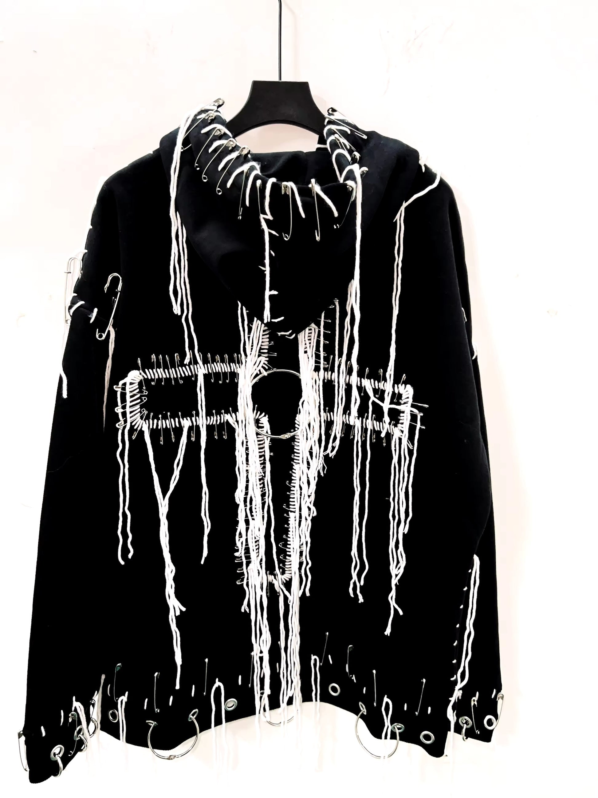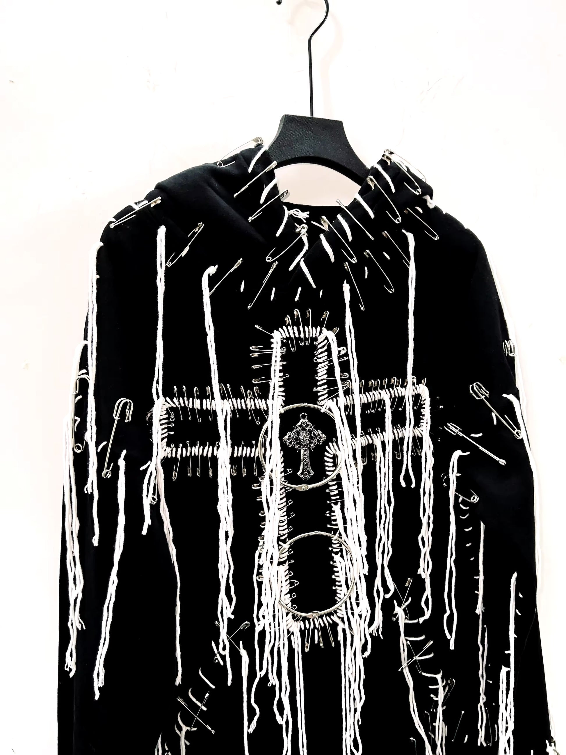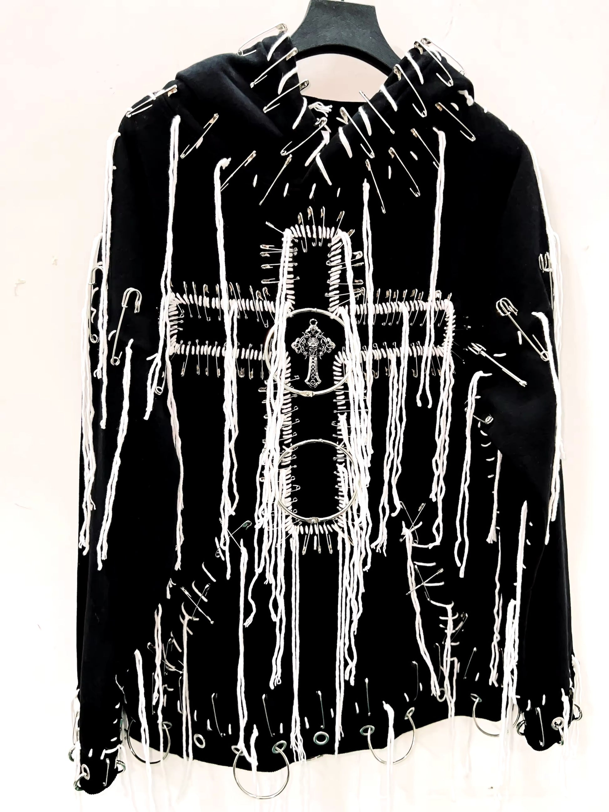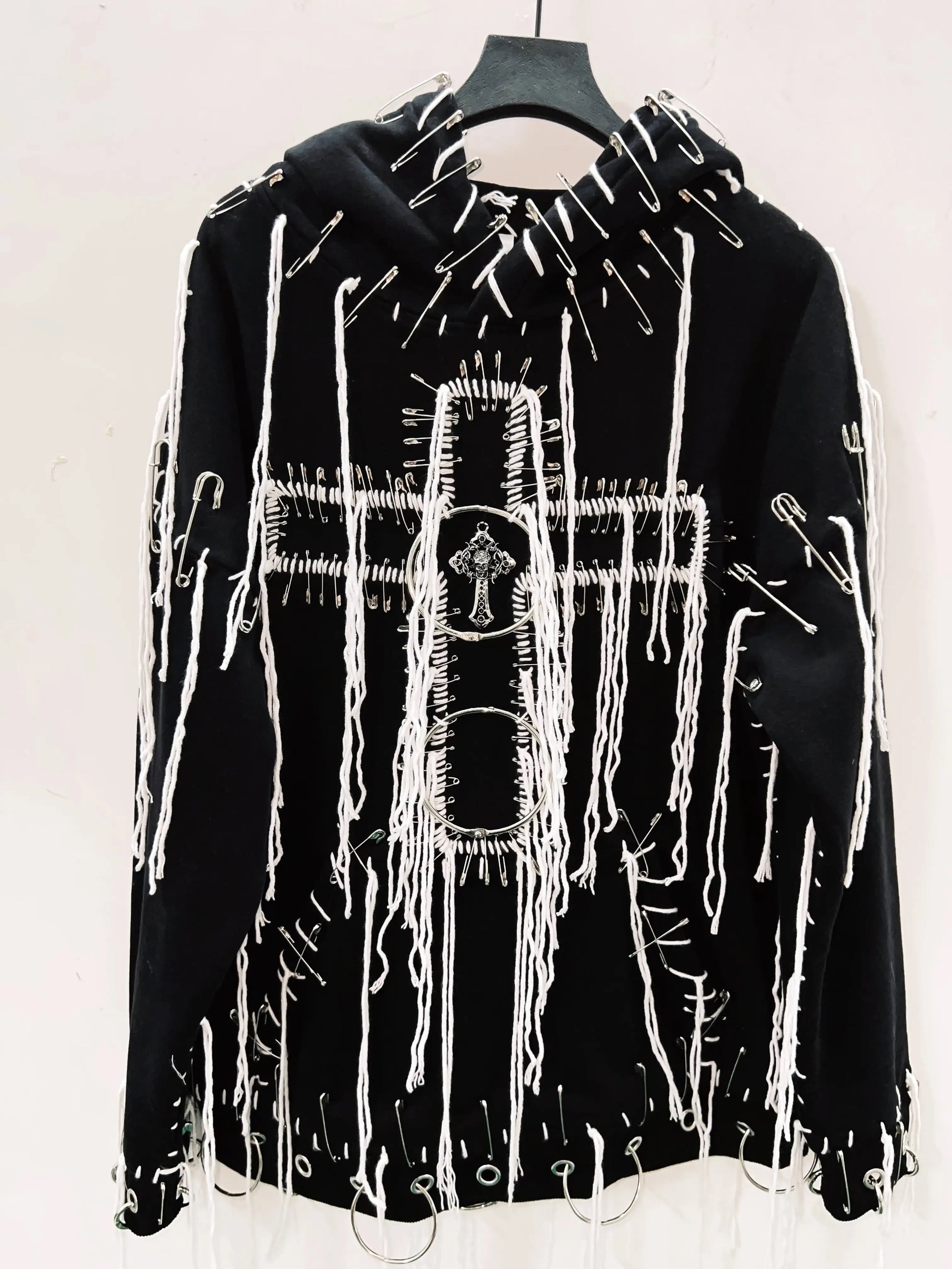 This Black Gothic Distressed Chain Cross Hoodie features contrasting white stitching for a bold look. The distressed finish adds a touch of edginess while the cross detail and o-ring silver hardware give it a unique touch. The oversized fit means there's no need to size up. Stay stylish and comfortable in this one-of-a-kind hoodie.