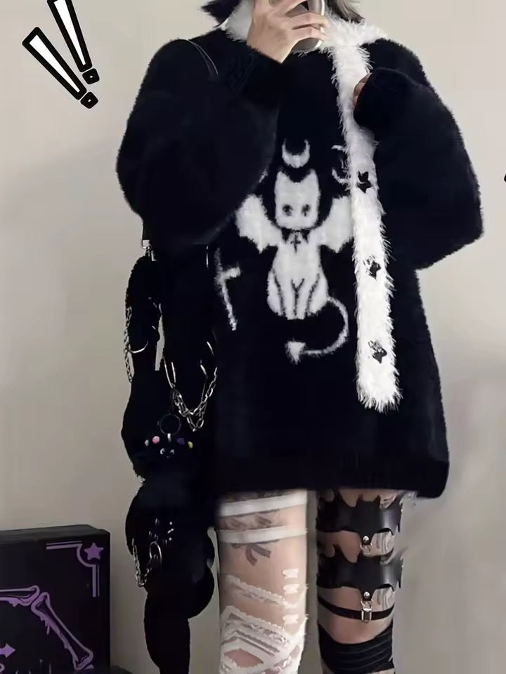 Black Gothic Satans Familiar Cat Oversized Knitted Jumper