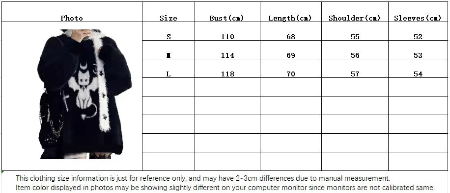 Stay warm and stylish this winter with our Black Gothic Satans Familiar Cat Oversized Knitted Jumper. Made with soft, knitted fabric, this oversized jumper features an eye-catching gothic cat print in white. Don't sacrifice fashion for warmth – this must-have jumper is perfect for goth girls. Check out our size guide in the images.