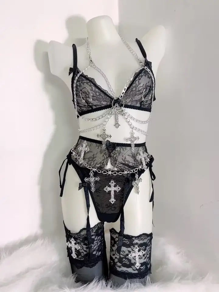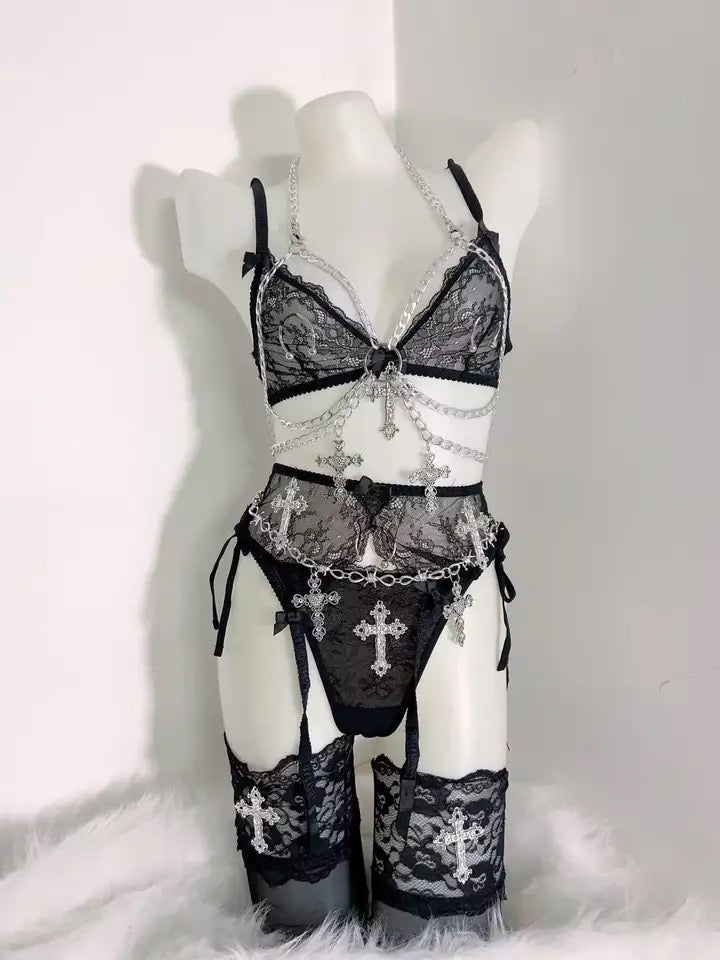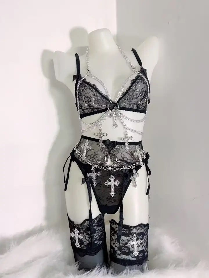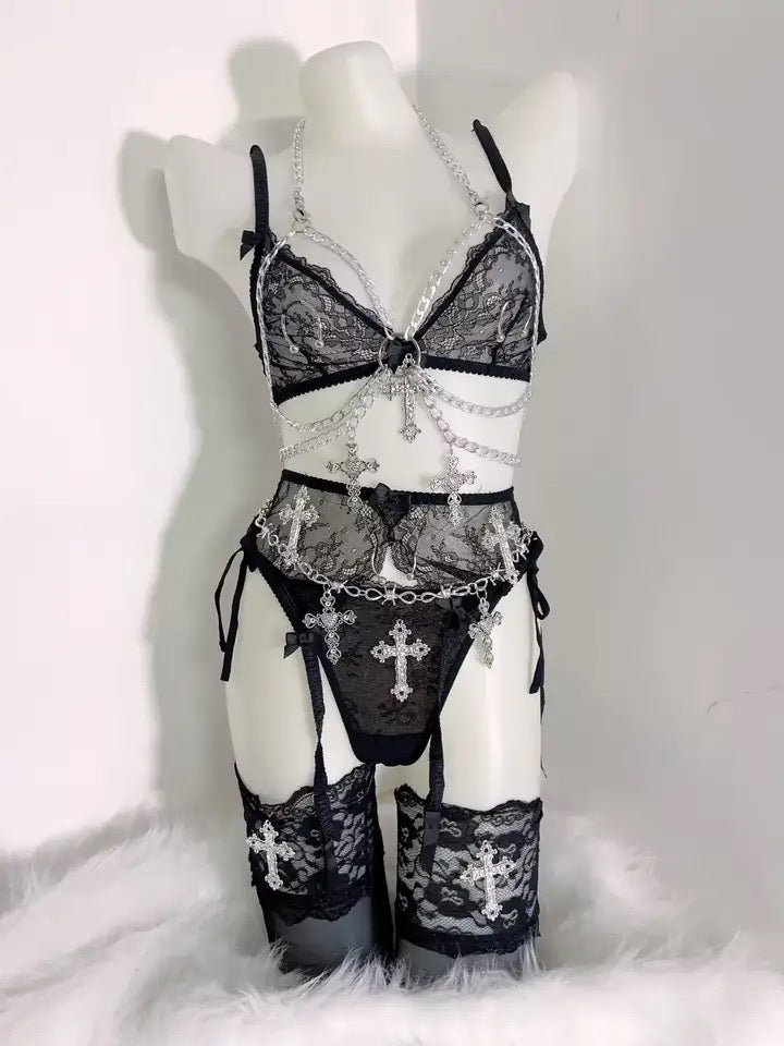 Look and feel ultra-glamorous in this six piece lingerie set. Featuring a romantic lace bra, a chain harness belt, a chain belt, a garter belt, a pair of stockings, and panties, this set is sure to make you stand out! Complete with gothic cross pendants, this is designer lingerie at its finest.