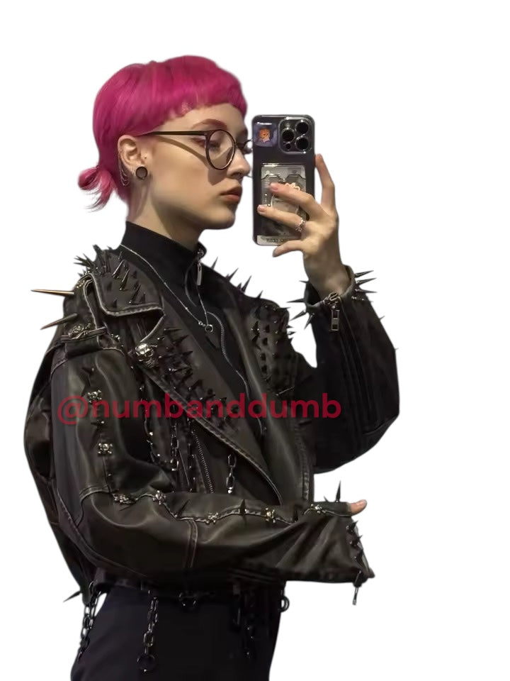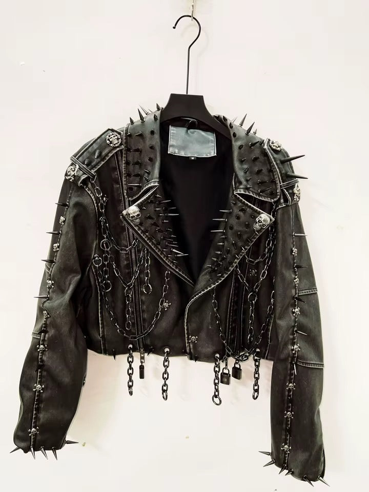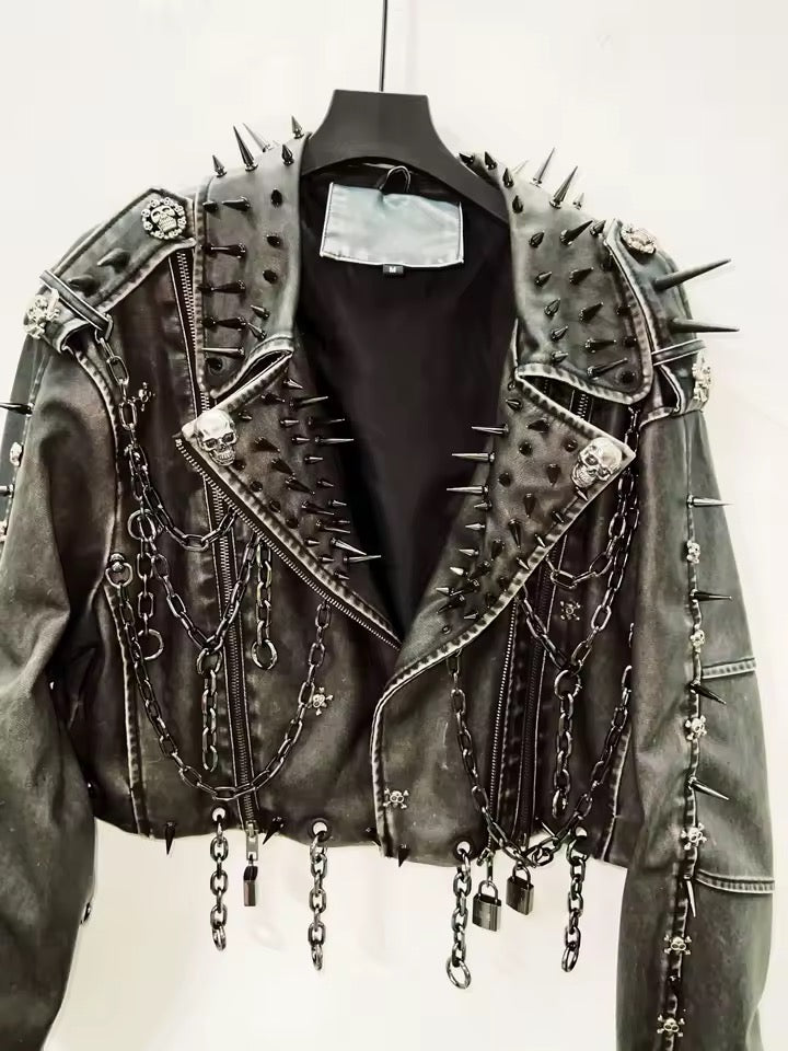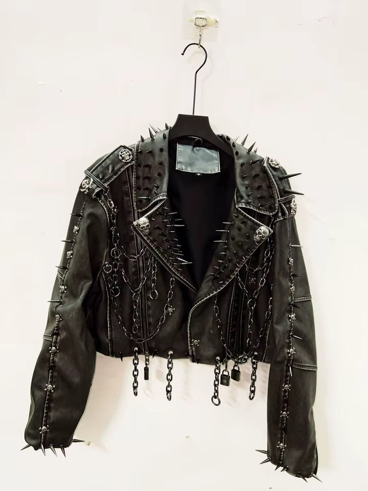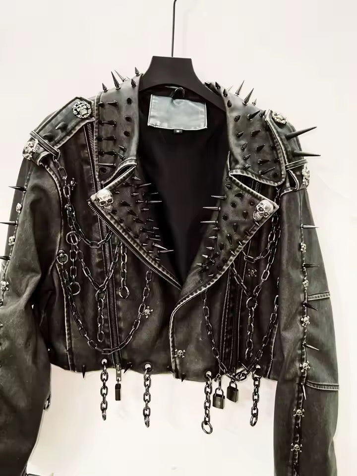 Expertly crafted from distressed faux leather, this Black Leather Skull Spike Studded Punk Jacket is a timeless piece for any punk enthusiast. The silver spike studs and skull pendants add a rebellious edge, making it a bold and customised statement. Perfect for those looking to add a touch of punk to their wardrobe.