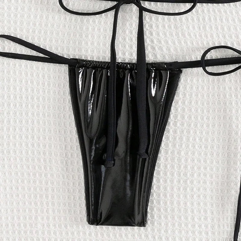 This Black Metallic Faux Leather Micro Bikini Set is crafted from PVC metallic style fabric, delivering a uniquely bold and eye-catching look. Its micro bikini design highlights your curves while providing a comfortable and flattering fit. Stand out in style with this must-have set.