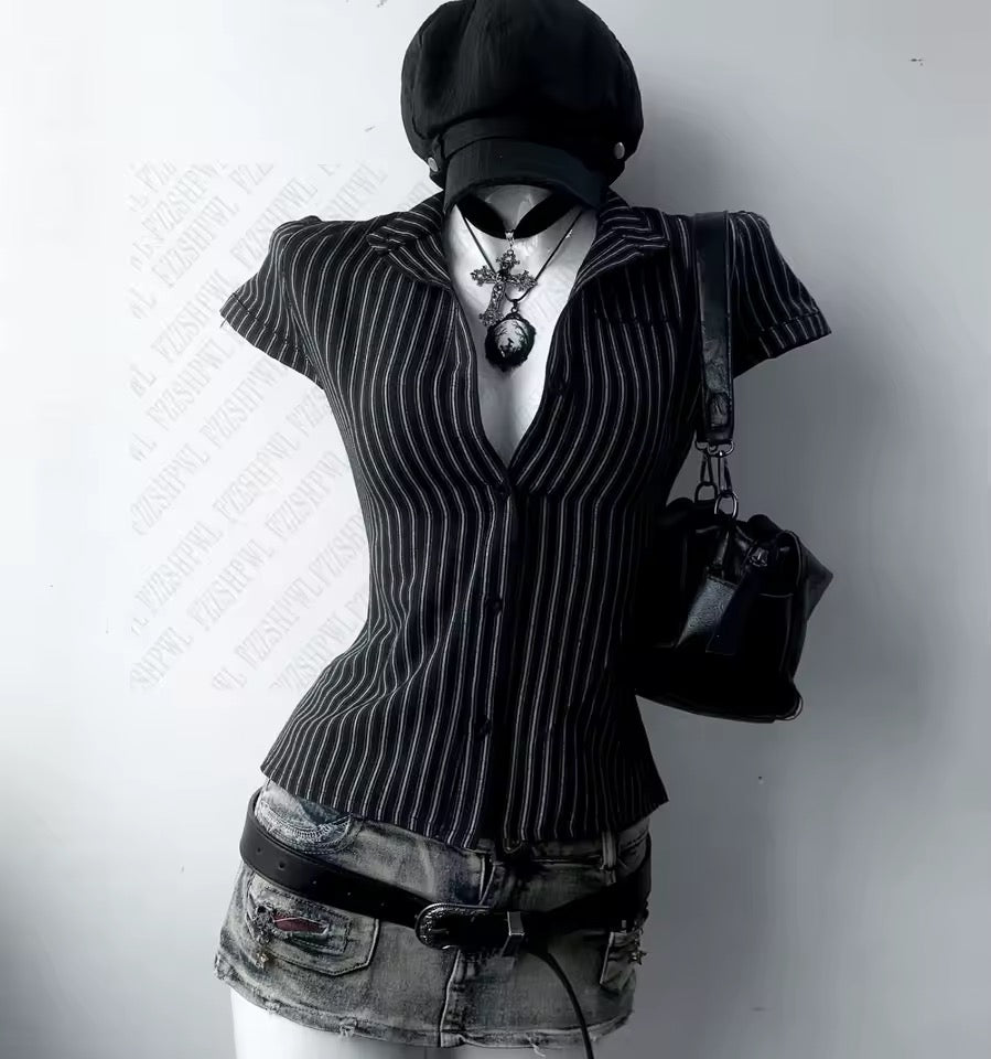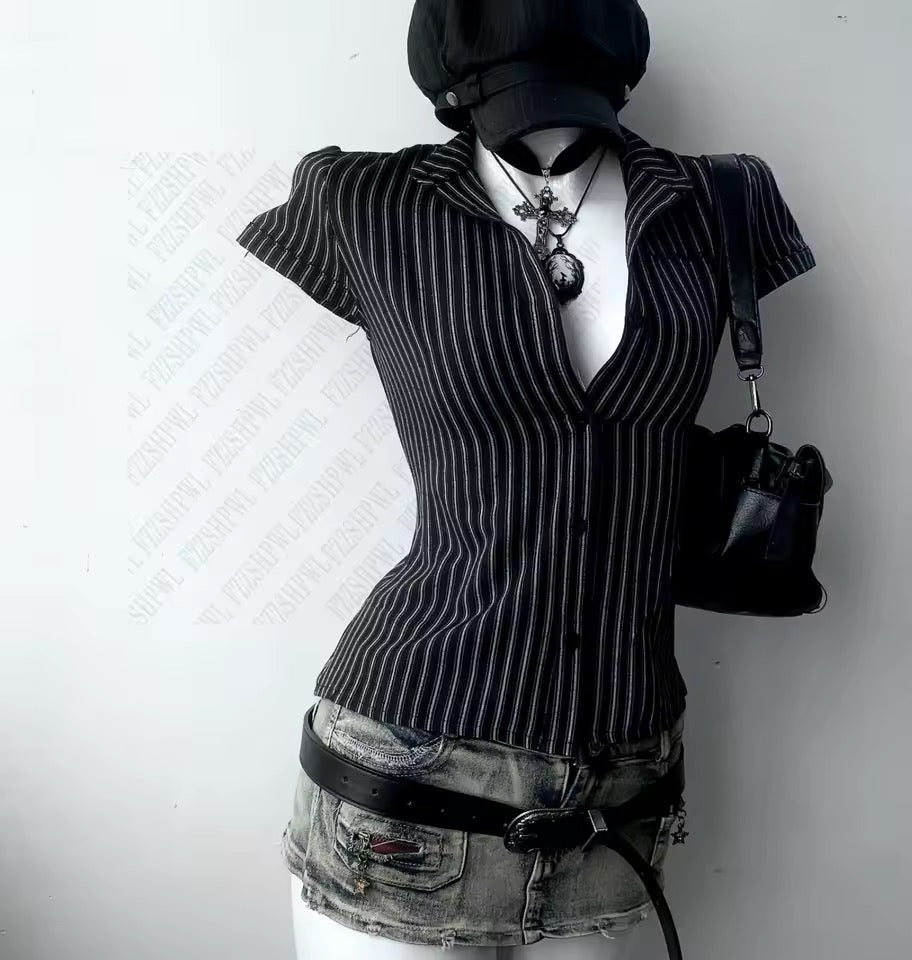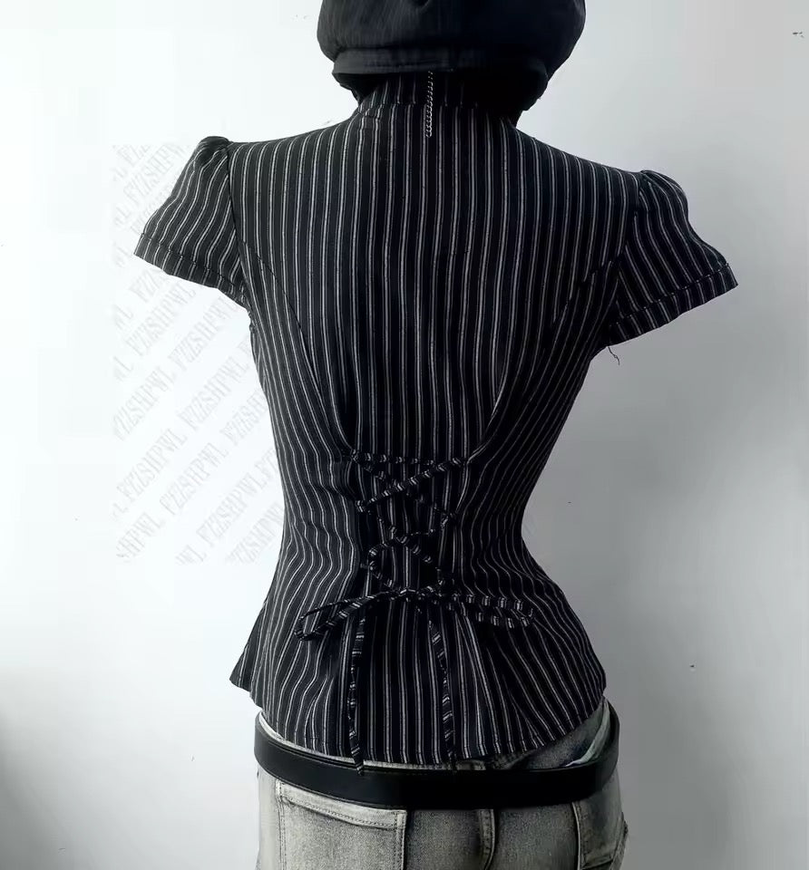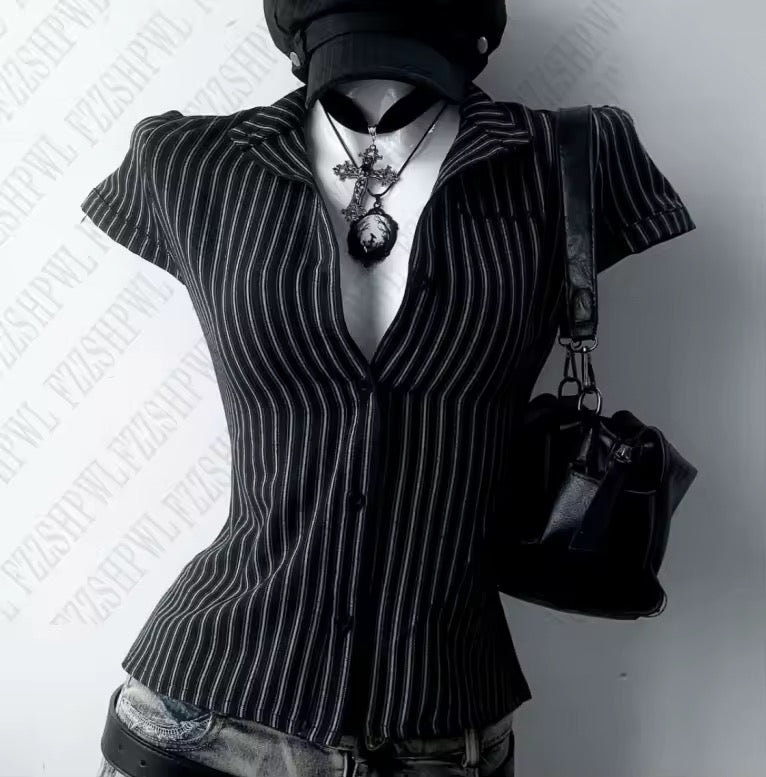 Black Pinstripe Gothic Corset Short Sleeve Shirt