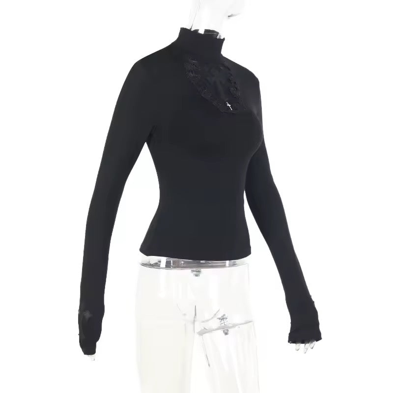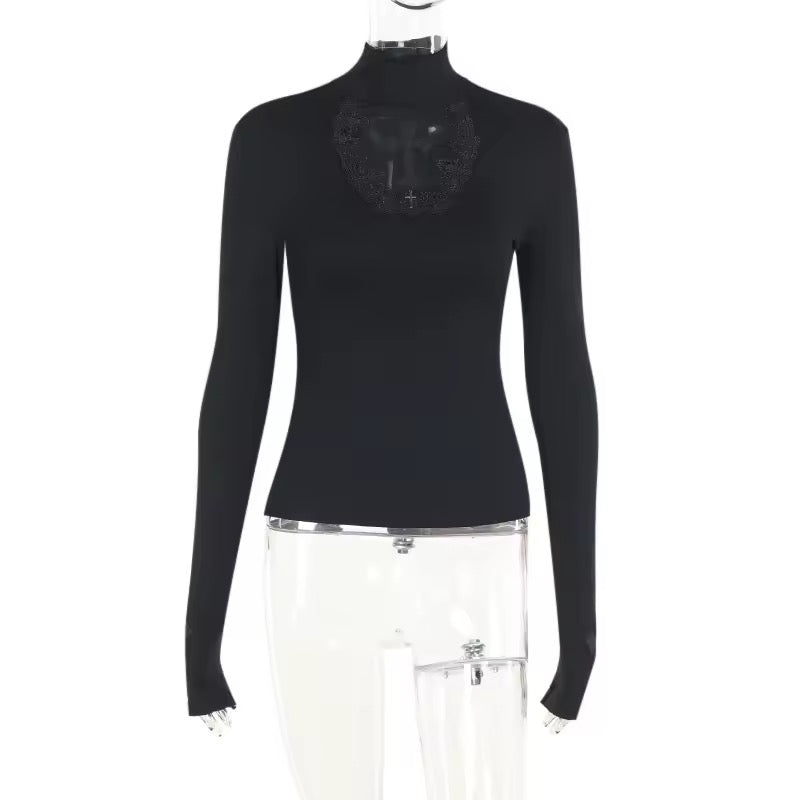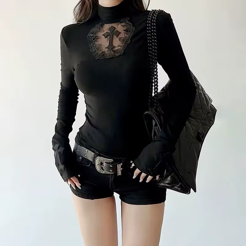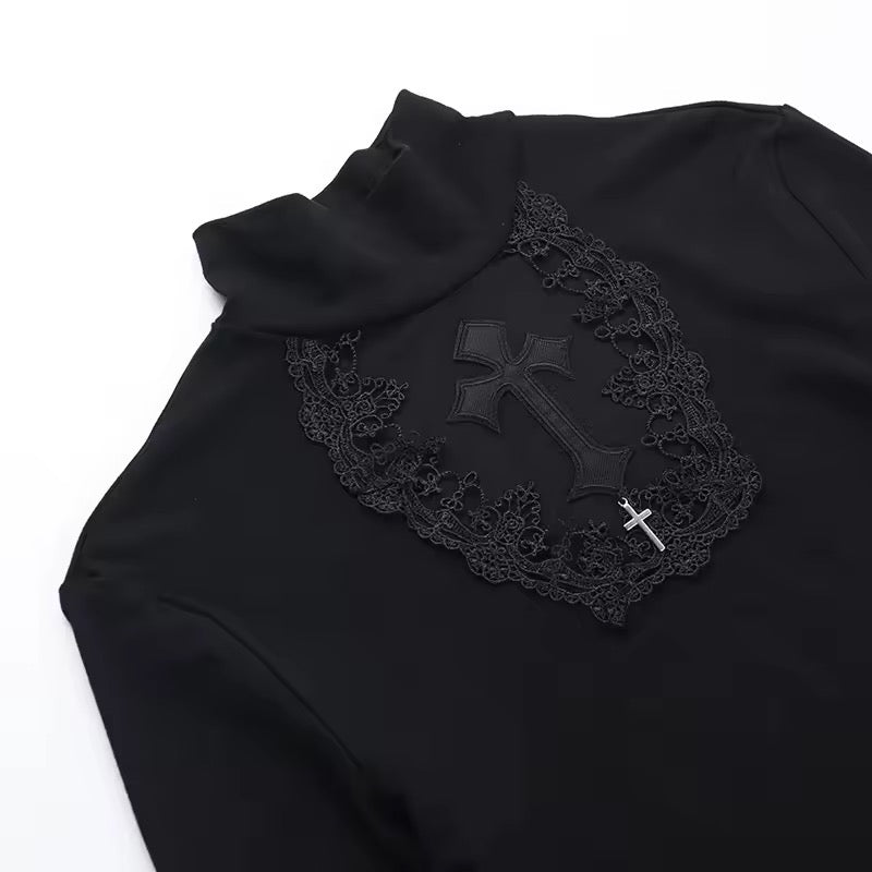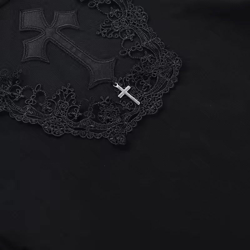 Black Priestess Gothic Mesh Cross Long Sleeve Top