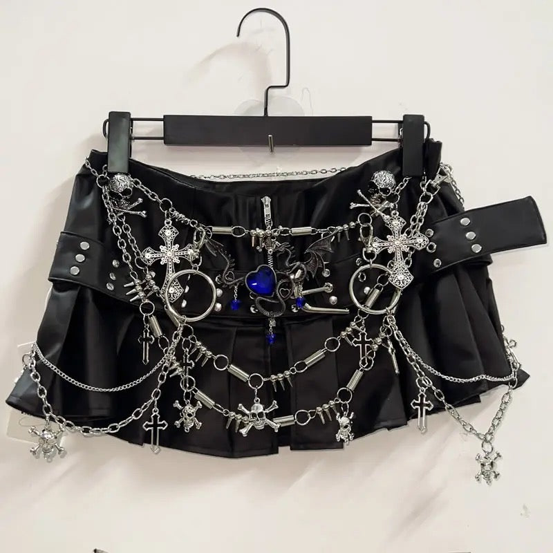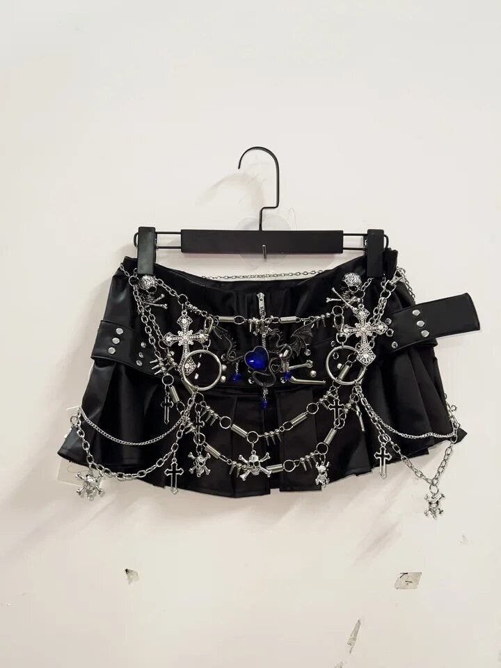 This Black Punk Chain Faux Leather Micro Mini Skirt is a rebellious and stylish addition to any wardrobe. The detachable belt allows for versatile styling options, while the silver chain belts with gothic charms add a unique touch of edge. Available in sizes S (hip 90cm length 21cm), M (hip 94cm length 22cm), and L (hip 98cm length 23cm).
