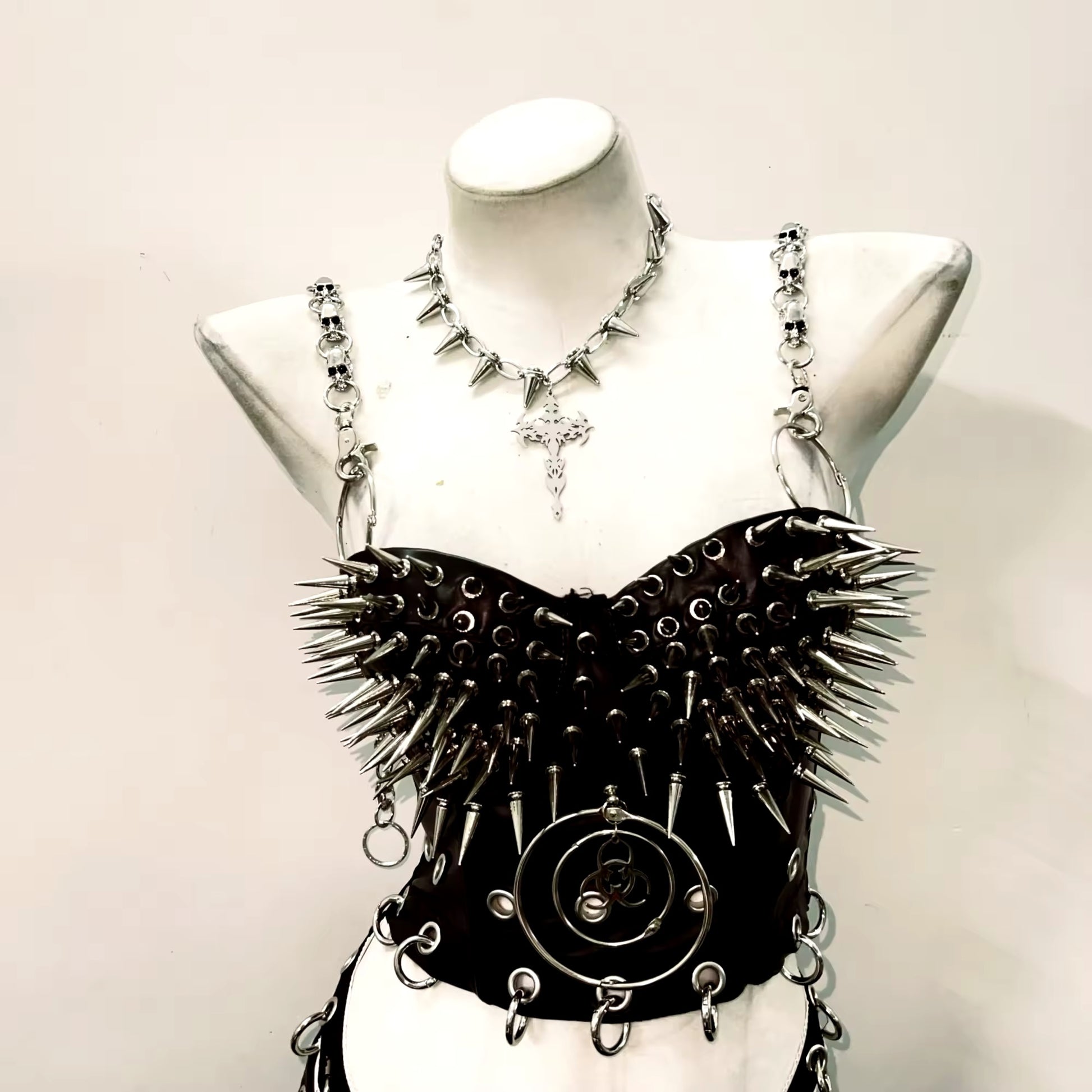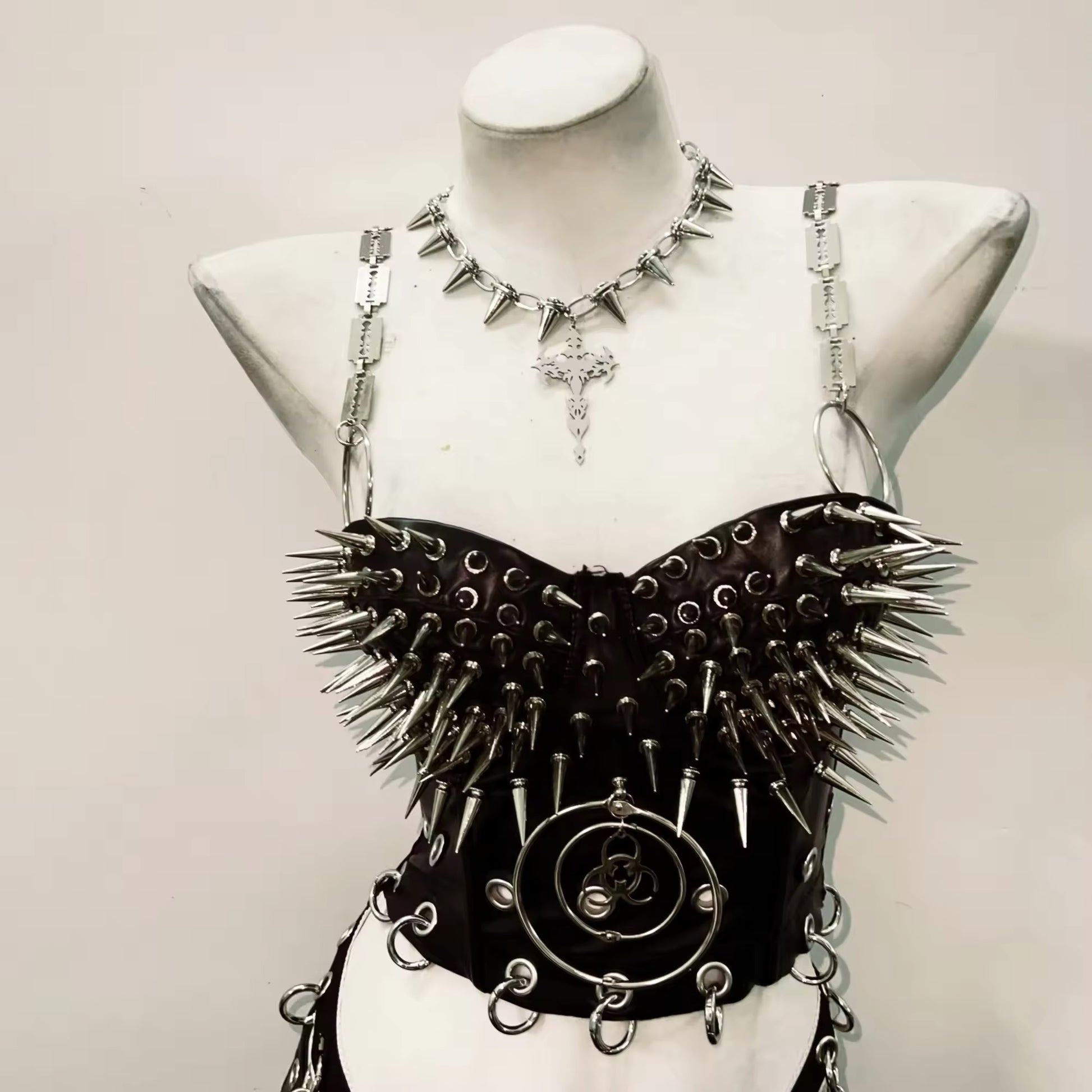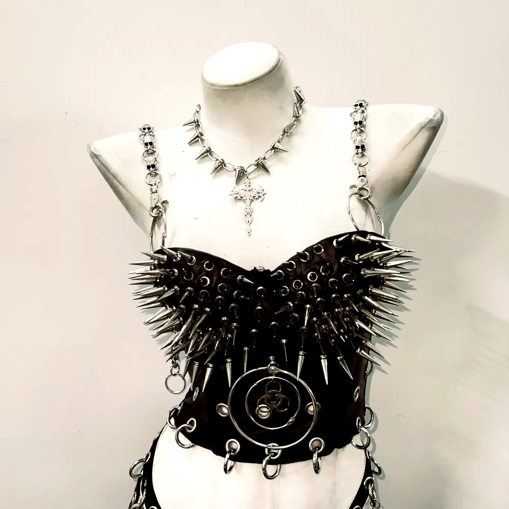 This edgy corset features silver spike studs and chain straps, giving off a bold punk vibe. Complete the look with the included gothic choker necklace. Choose from razor or chain straps for added customization. Elevate your style with this daring and unique piece.