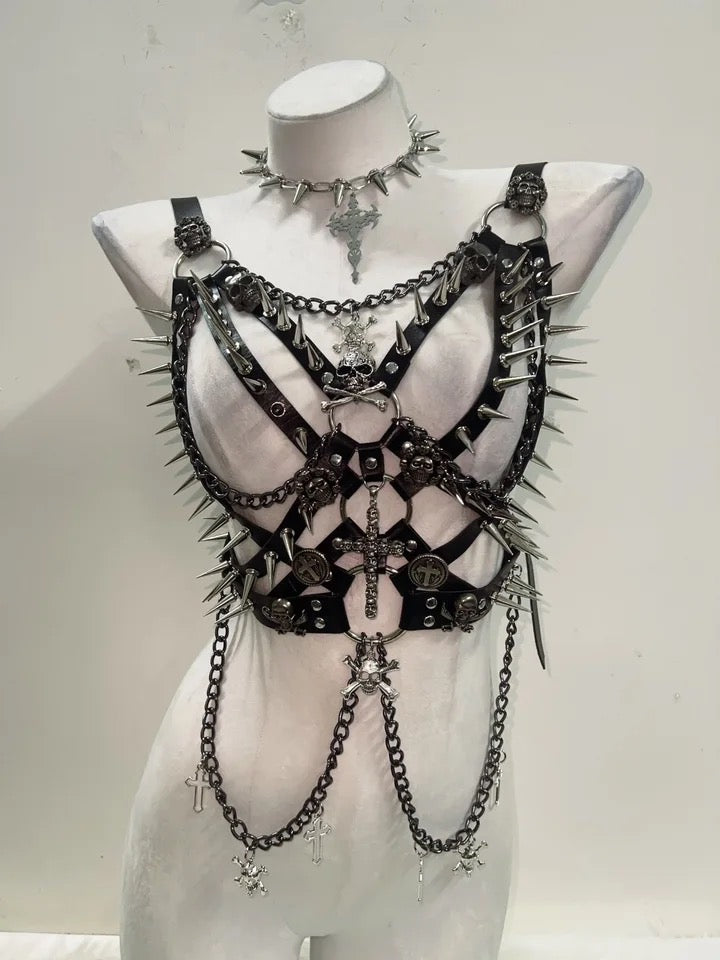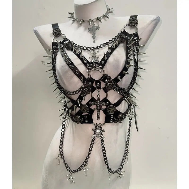 This Black Punk Faux Leather Spike Chain Cage Body Harness will add an edgy touch to any look. It features a cage-like harness with intricate spike studs, chains, and gothic charms to give a unique punk aesthetic. Complete with an accompanying chain choker, this harness can be worn as a set or separately for a more subtle look.