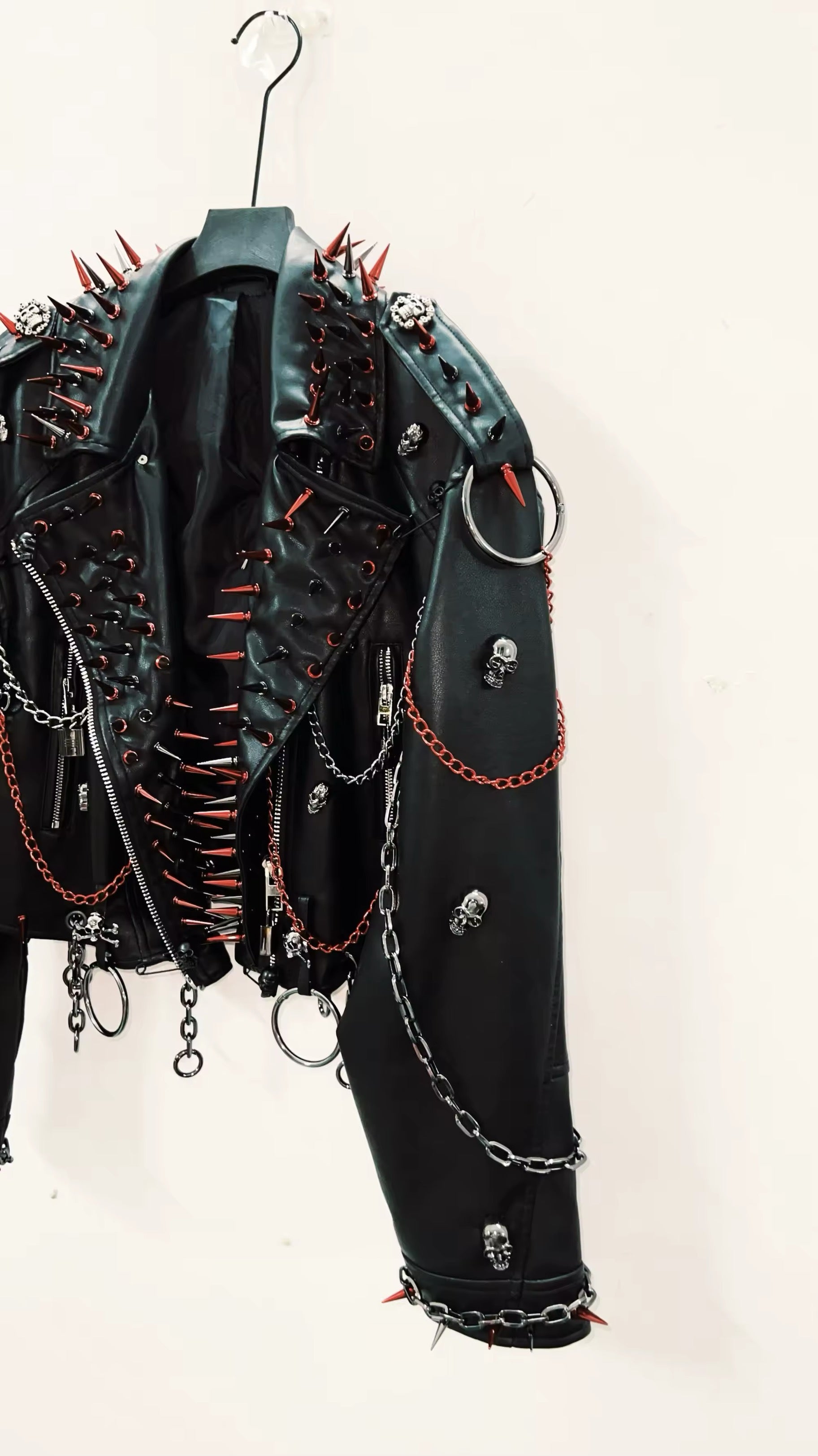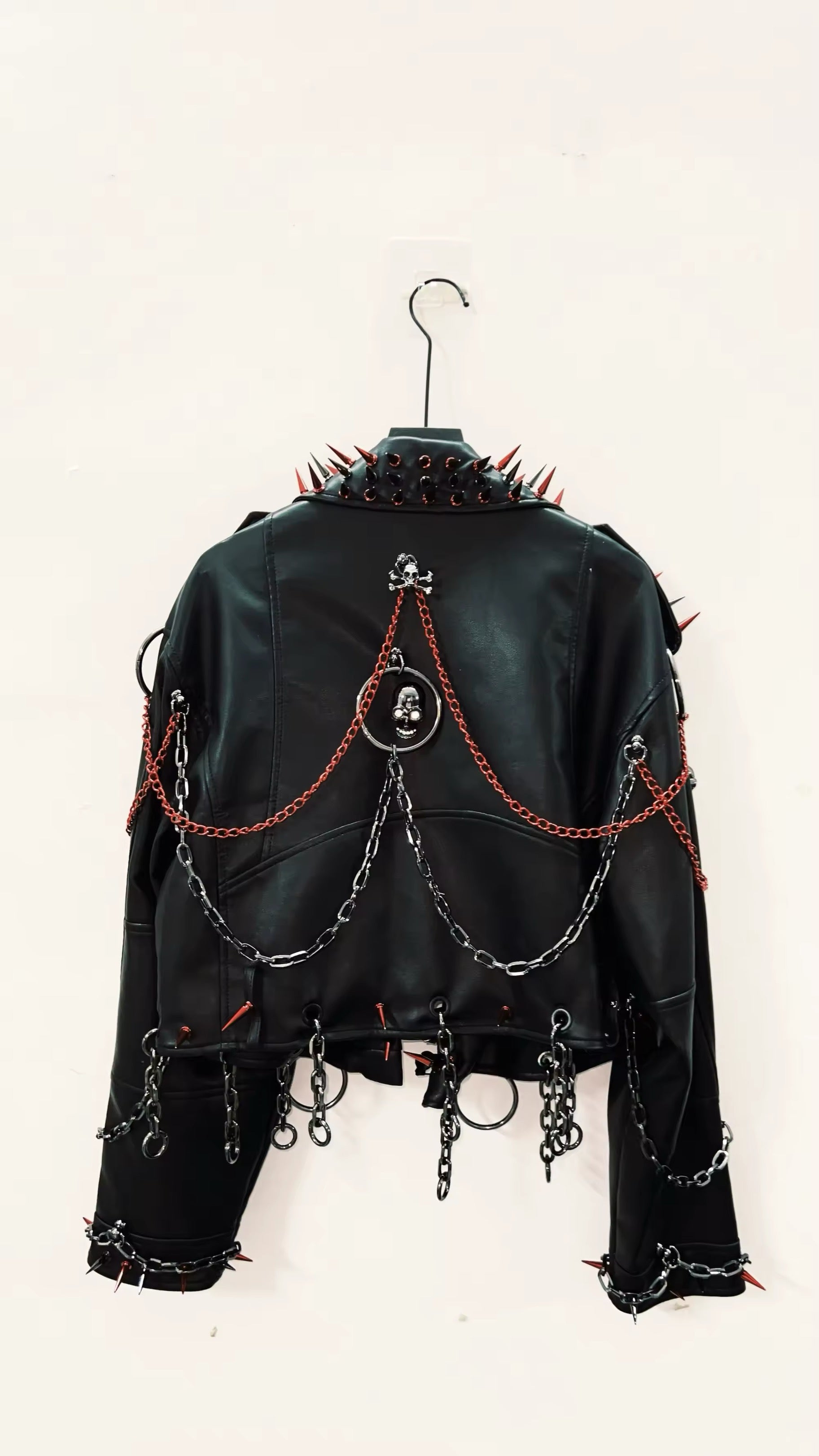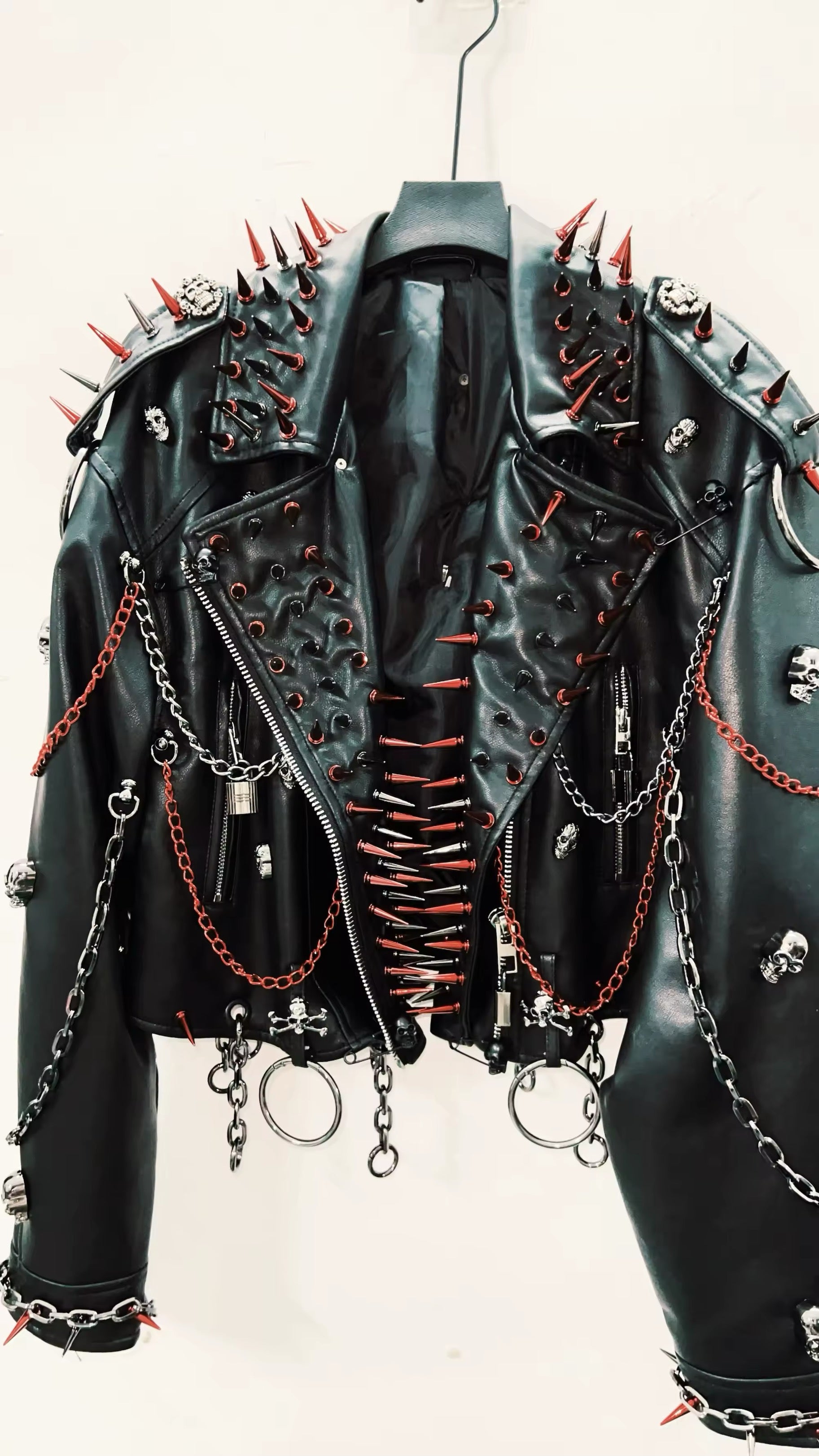 Get ready to rock in style with our Black Punk Skull Chain Studded Biker Jacket. Made from high-quality faux leather, this jacket features a zip fastening and striking skull pendants. The contrasting red and silver spike studs, along with metal chains, add a rebellious edge. Check out our size chart in the photos to find your perfect fit.