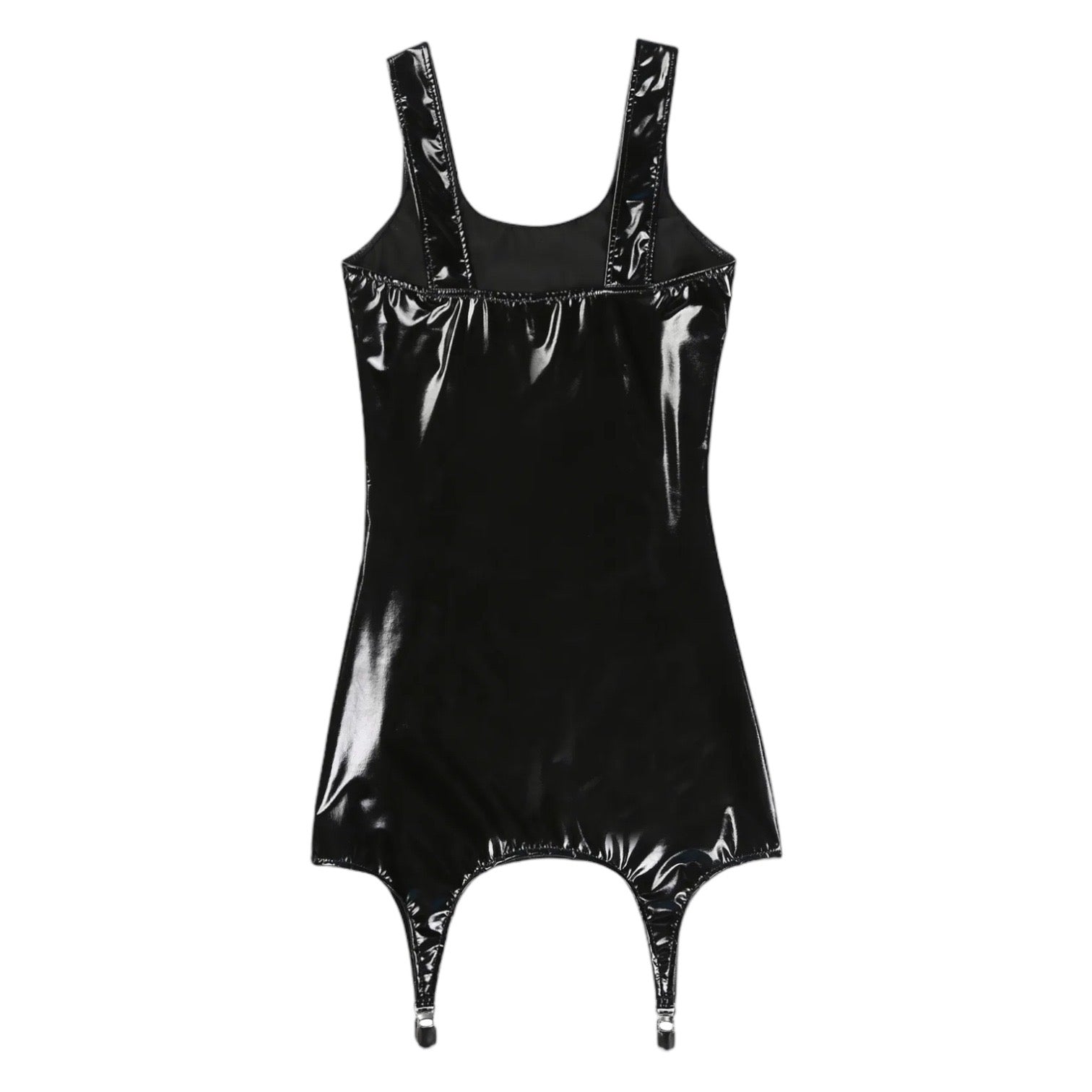 The Black PVC Suspender Body Con Mini Dress is the perfect combination of style and comfort. Made with PVC fabric and attached suspenders, it will keep you looking and feeling your best. Featuring a sleek and chic design, this dress is sure to make a statement.