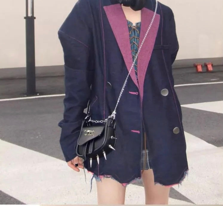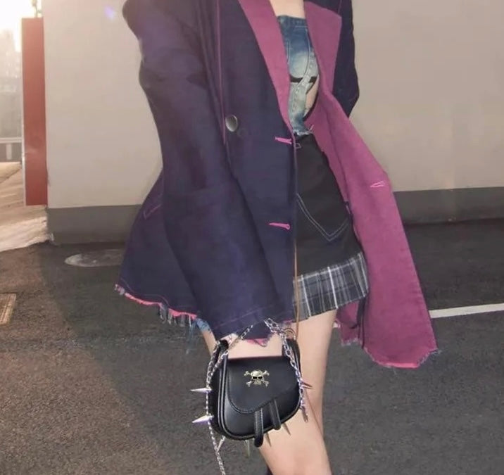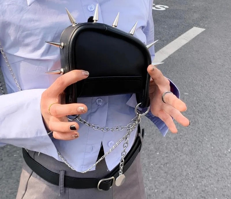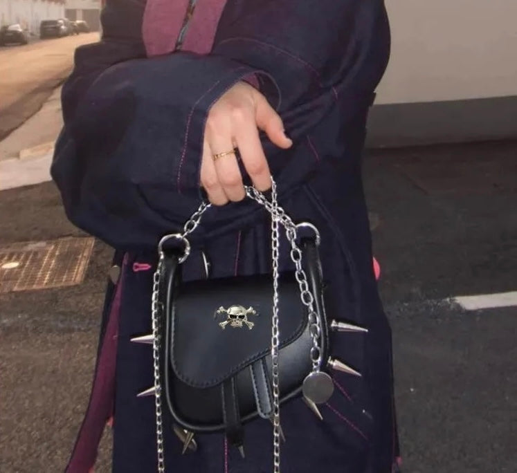 This 20x20cm Gothic Chain Bag makes a bold statement with its skull pendant and spike stud detailing. The popper fastening ensures it's secure, while the chain strap adds a finishing touch. Perfect to store your essentials with an edgy flair.