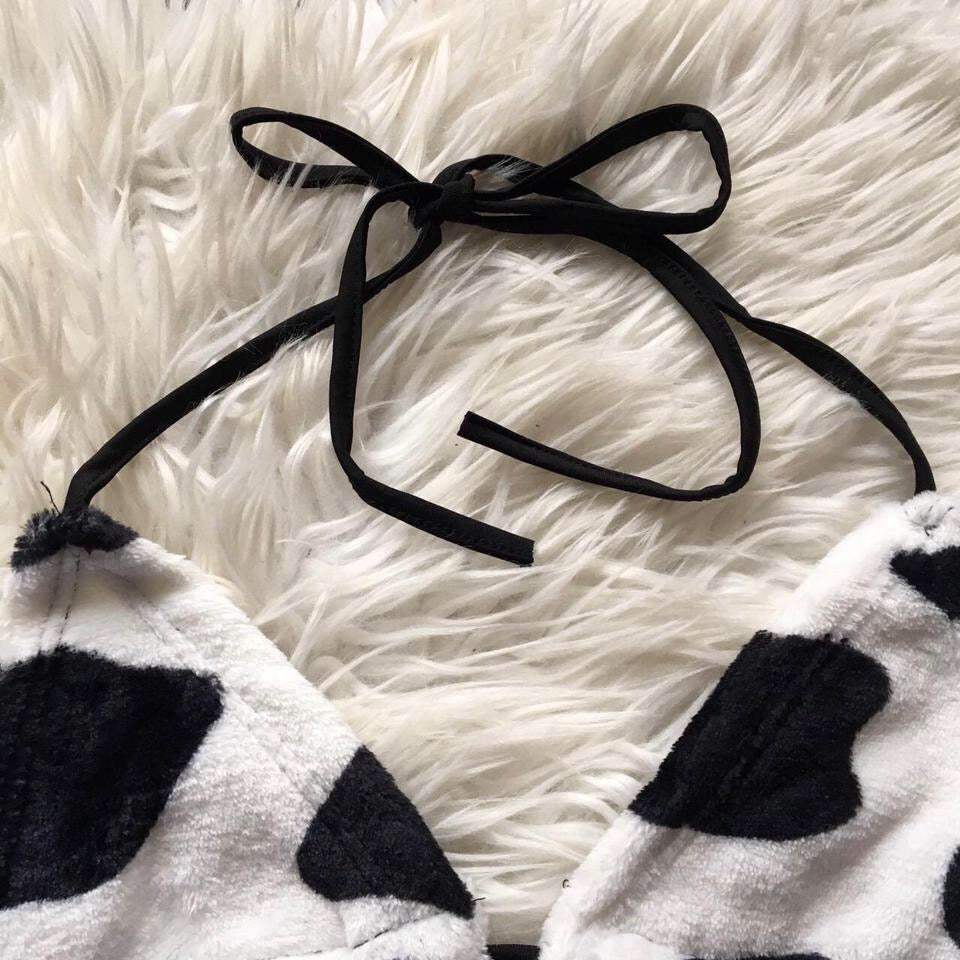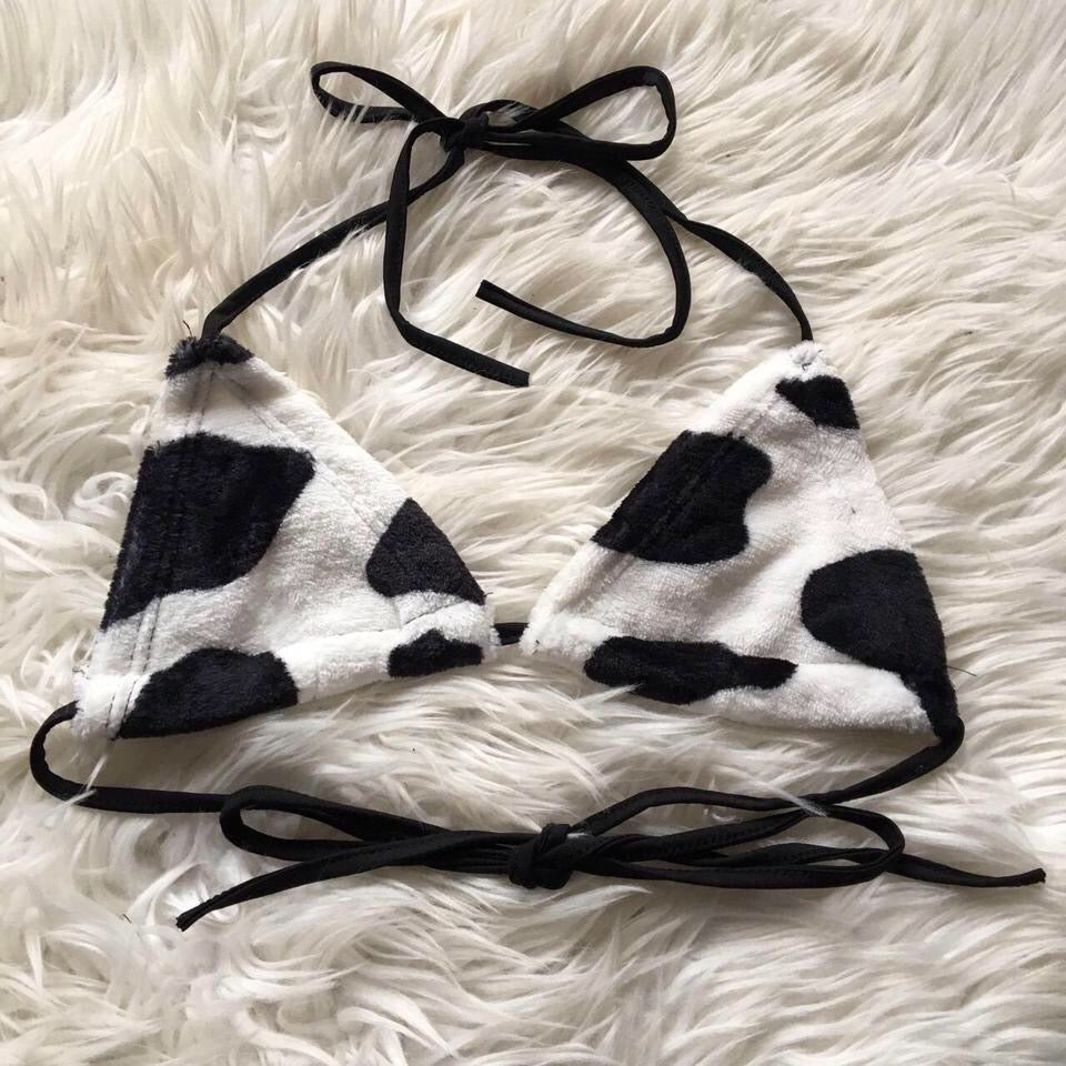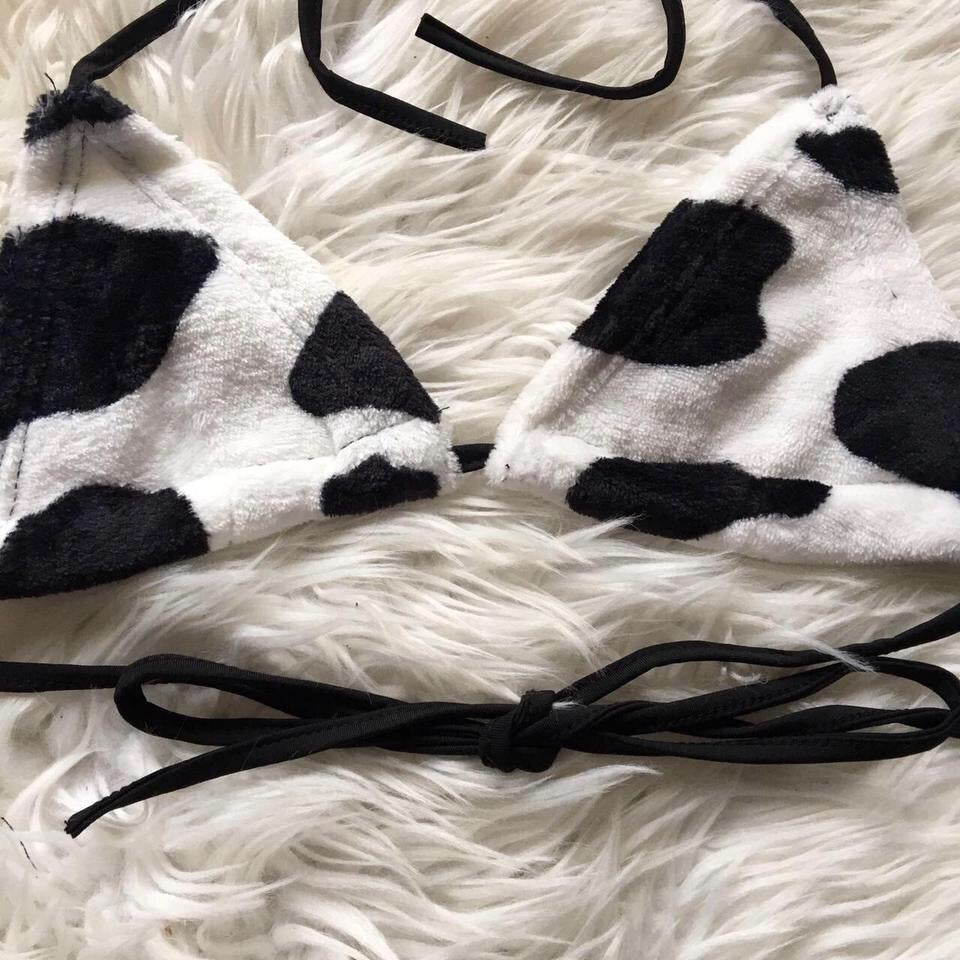 Introducing the Cow Print Fluffy Triangle Cup Bralet - the cutest cow in town! This fashionable and fun bikini top features a cow print design and fluffy triangle cups for a look that will moooo-ve you. Perfect for when you want to add a bit of jazz to your outfit!