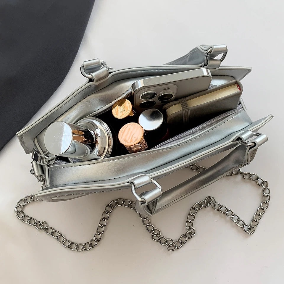 This Faux Leather Coffin Shape Chain Strap Gothic Bag offers a unique and bold look. Available in black, silver, and brown, the bag features a zip fastening and detachable silver chain and handle for a custom look. Perfect for making a statement.