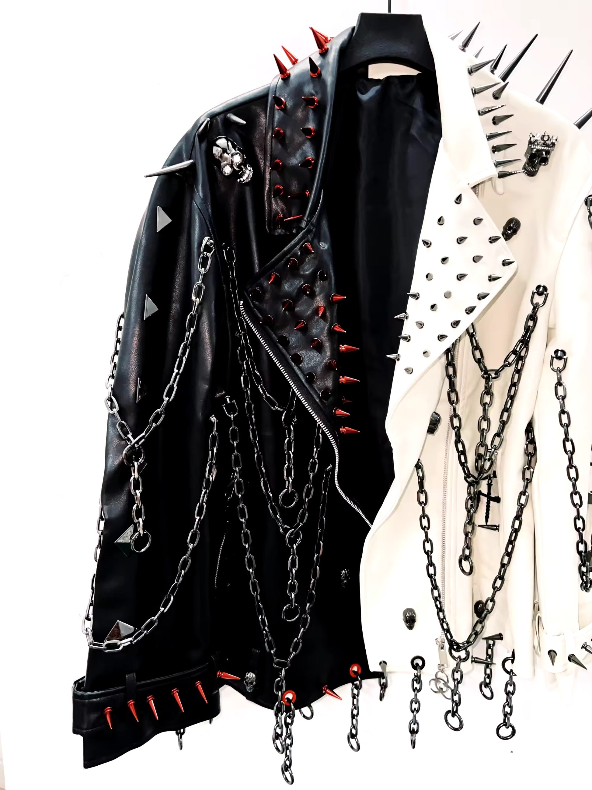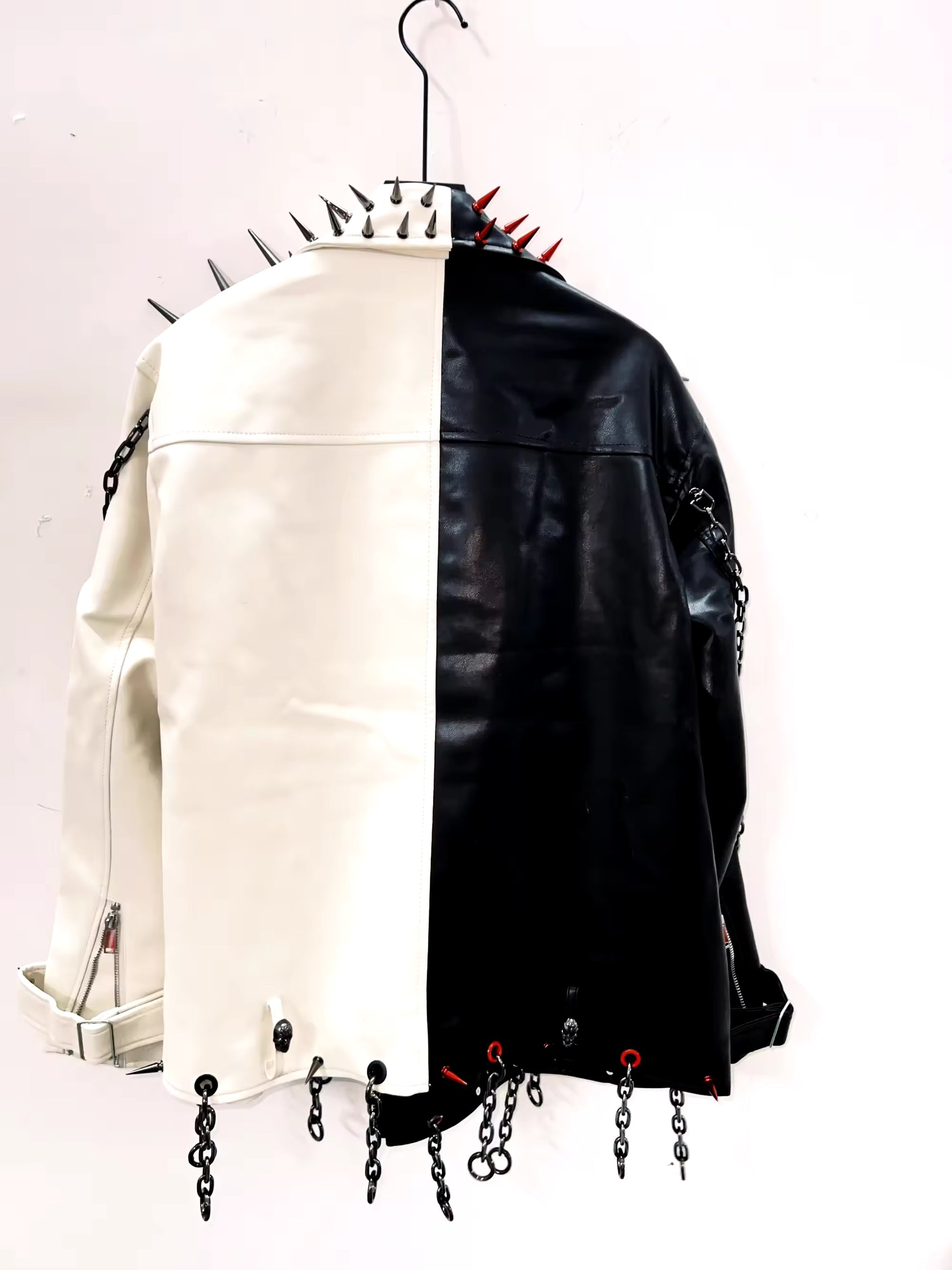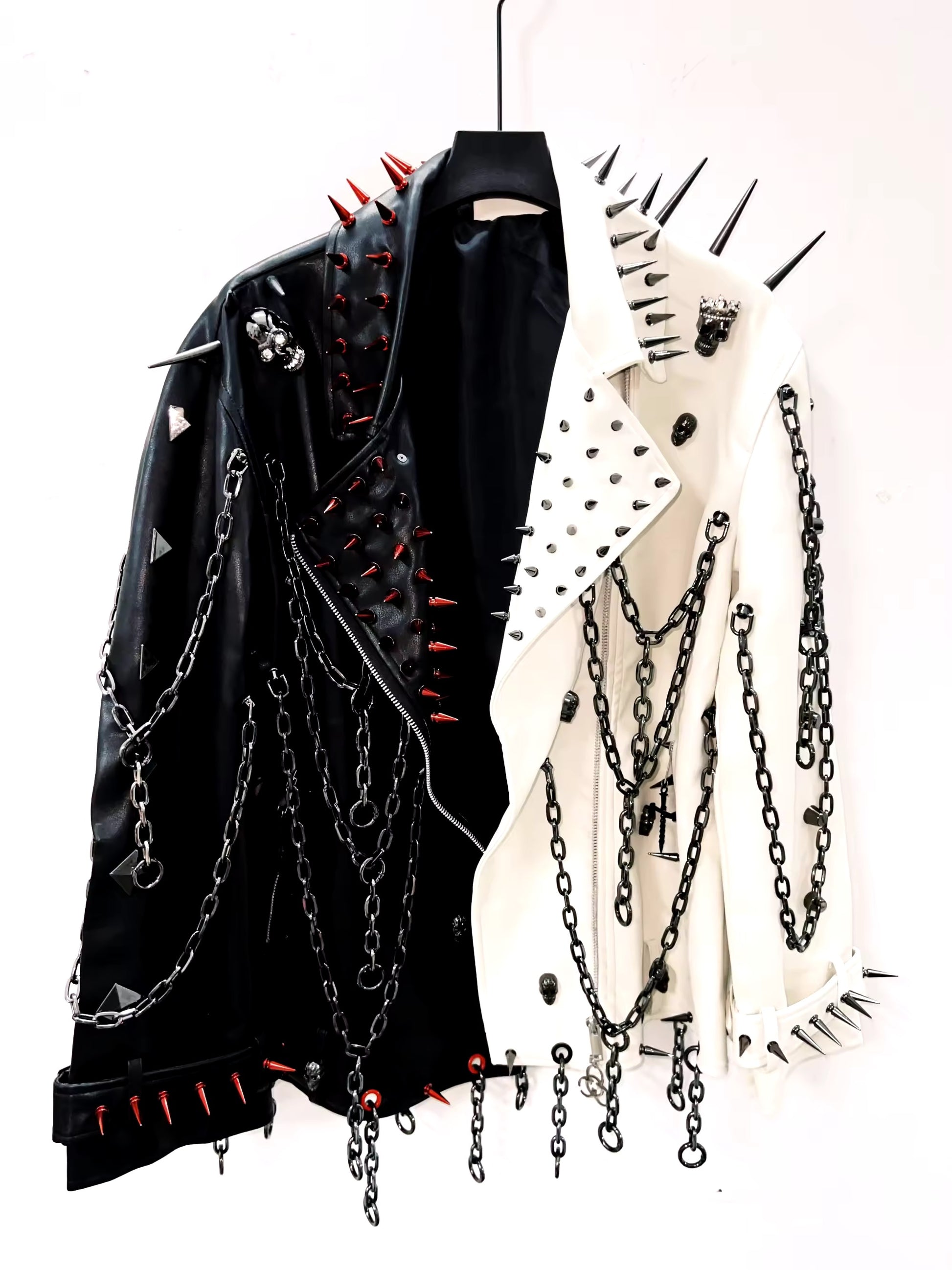 Experience the edgy style of our Faux Leather Monochrome Punk Studded Chain Jacket. Featuring a cream and black color scheme, this jacket is accented with striking black and red chains and skull pendants with spike studs. Get ready to make a statement with this bold addition to your wardrobe.