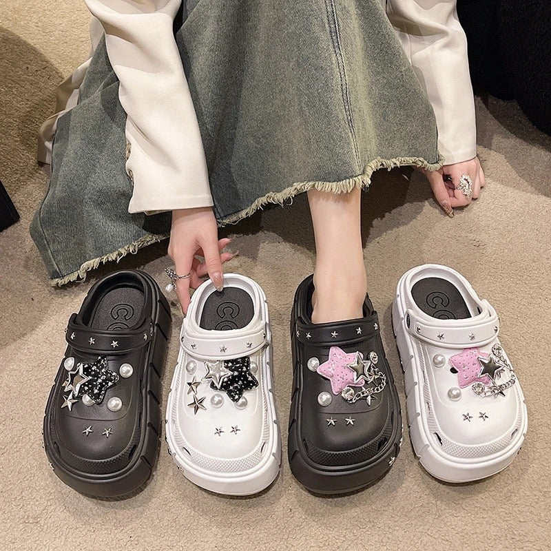 Elevate your style with our Gothic Chunky Platform Charm Rubber Studded Sandals. Choose from black or white, adorned with silver studded stars on the sole. Plus, customize your look with detachable charms. Versatile, edgy, and unique.