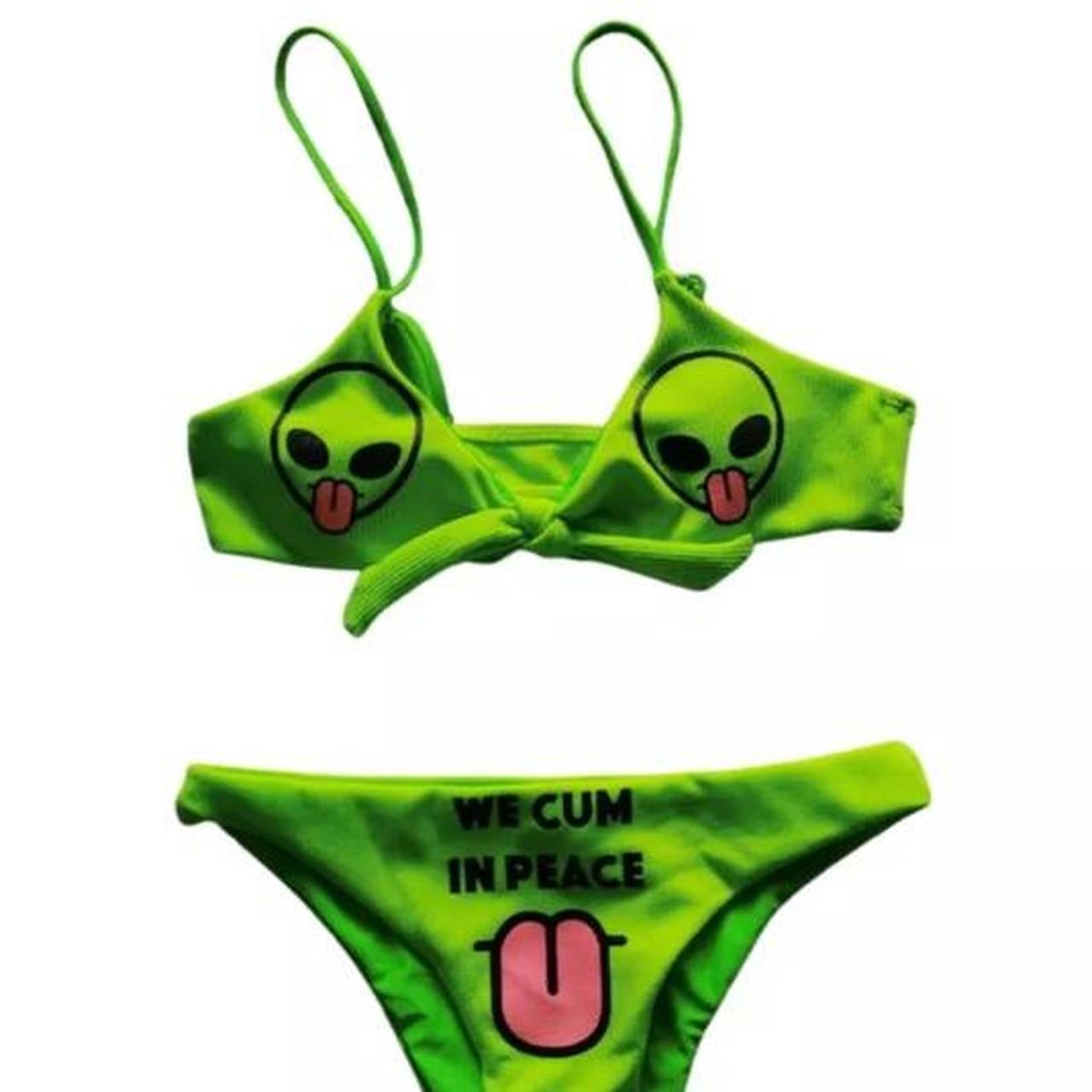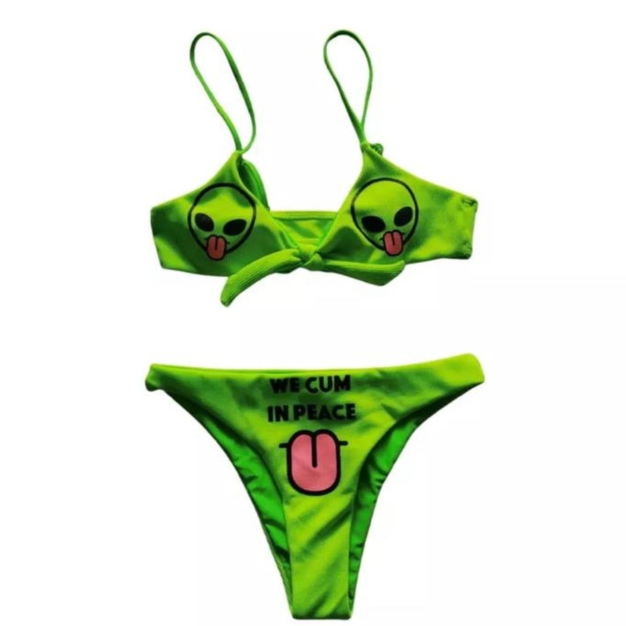Blast off in this out-of-this-world Green Alien Graphic 2 Piece Bikini Set! Featuring an extraterrestrial-approved green alien graphic and a hilarious slogan, you'll be lounging in alien-ating style. Get ready to turn some heads and take on intergalactic pool parties! (Who knew aliens and pool parties went together so perfectly?)
