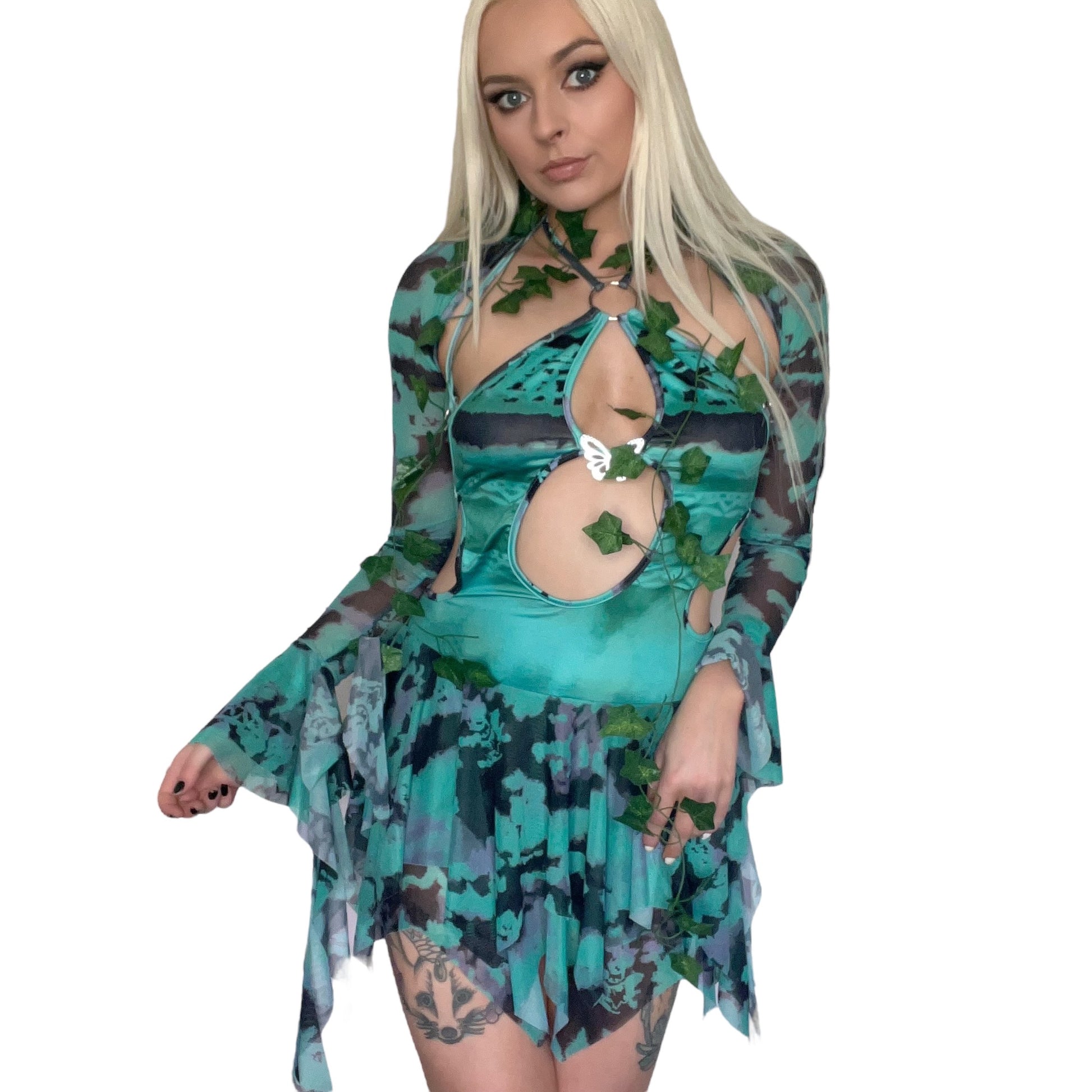 This Green Poison Ivy Fairy Halloween 2 Piece Mesh Dress Costume is the perfect choice for those looking for a unique and creative style. The Fairycore design offers a floaty skirt and sleeves with butterfly pendant and halter ties. The bolero is removable for versatility and convenience.