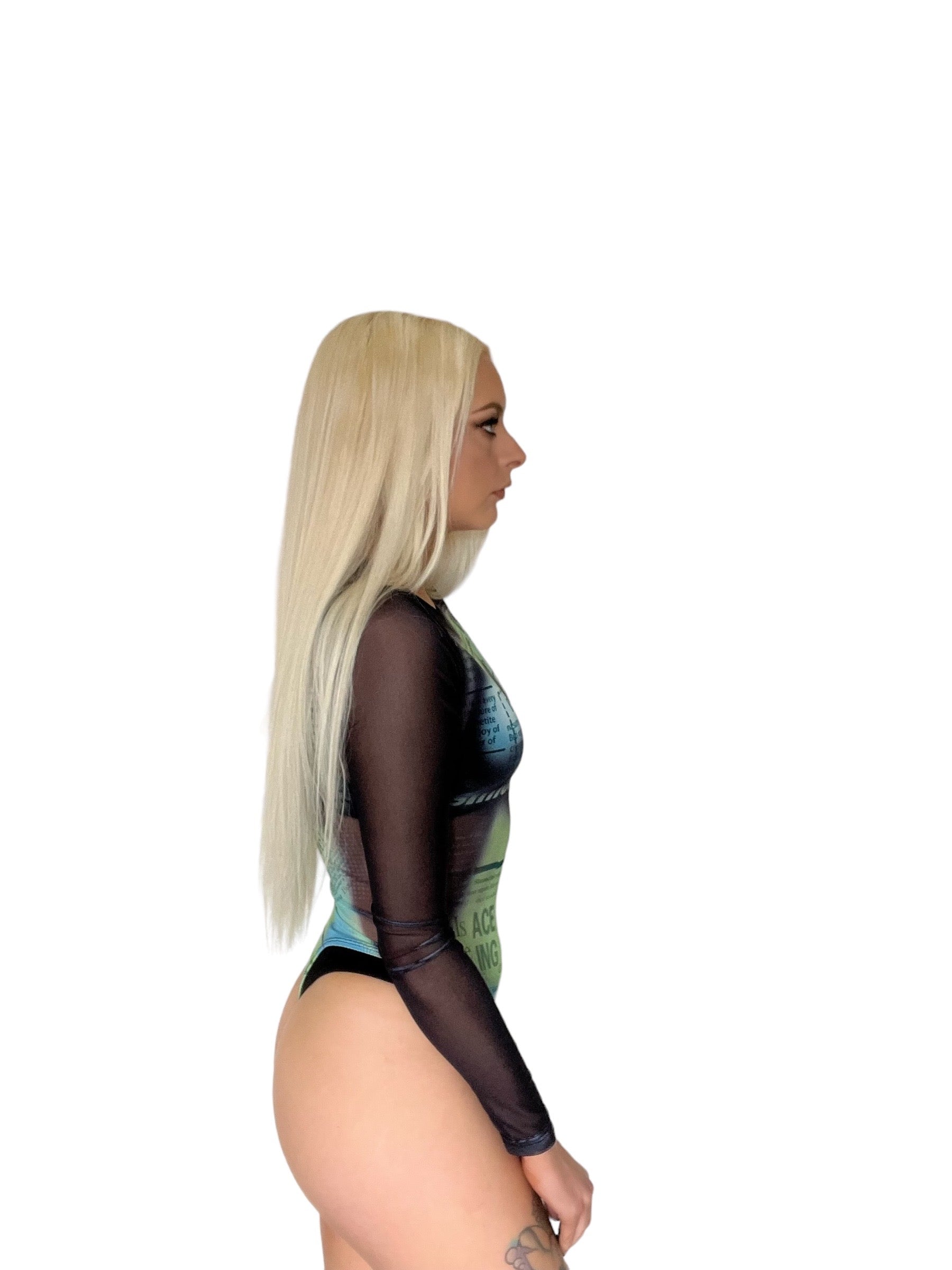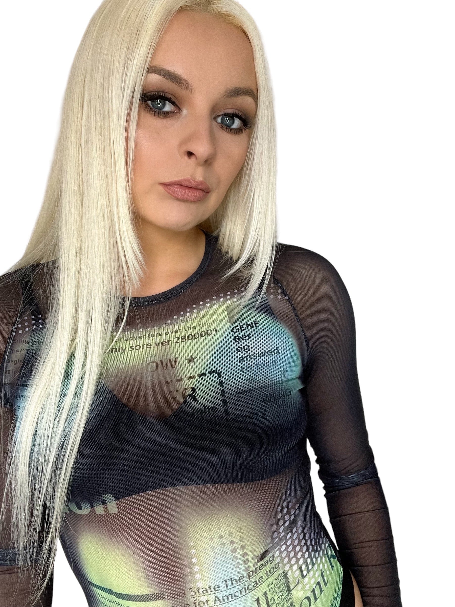 Mesh Long Sleeve Retro Newspaper Print Long Sleeve Bodysuit