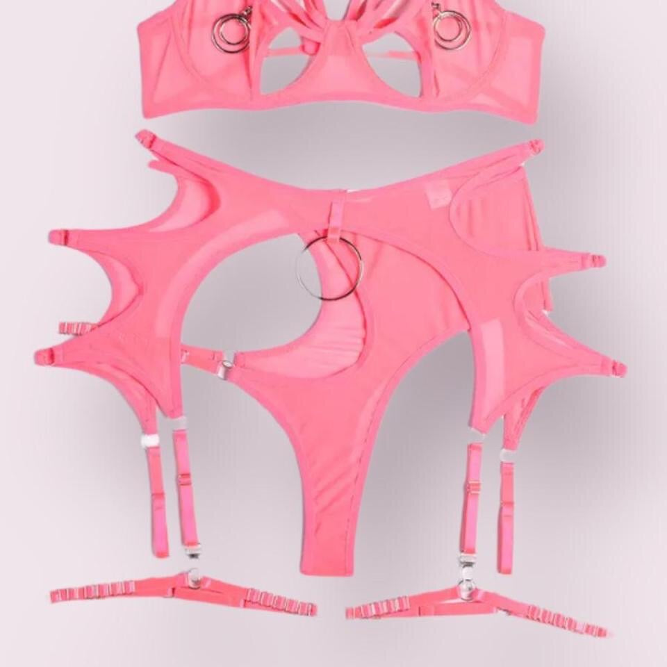 Pink Mesh O Ring Garter Lingerie Set