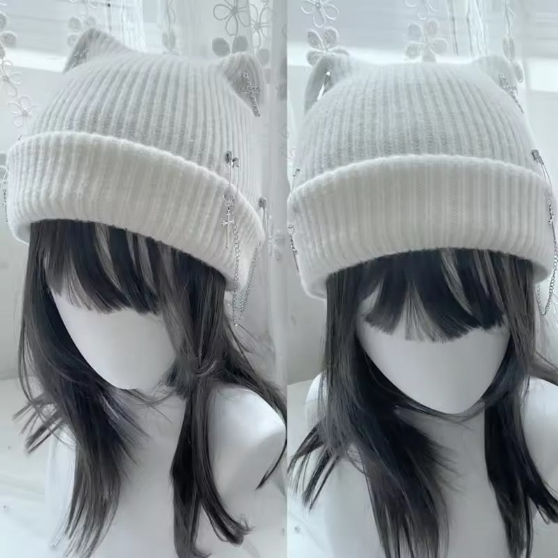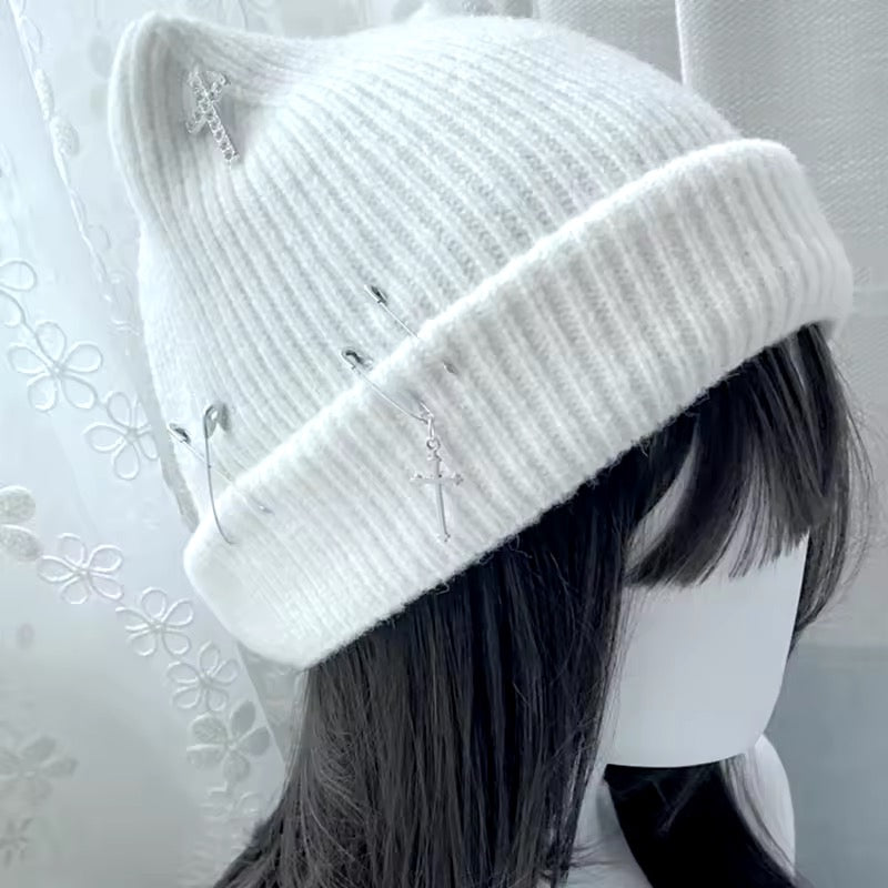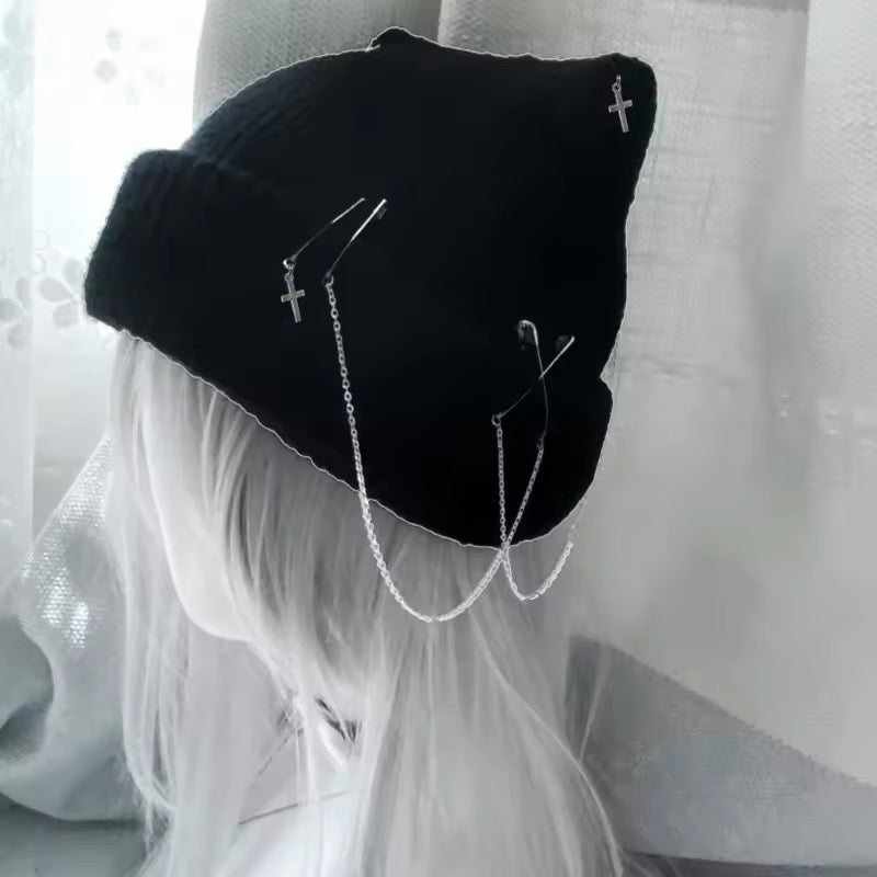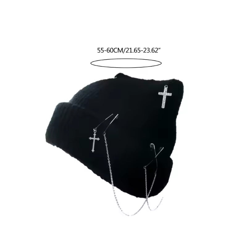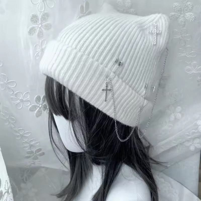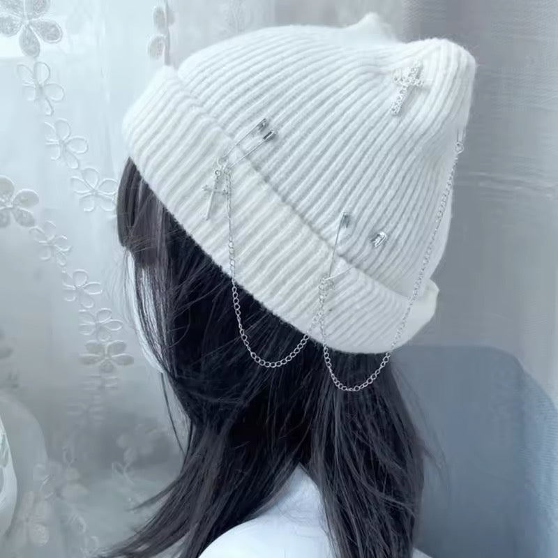 Add some edgy style to your winter wardrobe with our Punk Knitted Chain Kawaii Beanie Hat. Made from cozy knitted material, it comes in both white and black. Complete with chain, safety pin, and gothic cross charm pendants for a unique touch. Stay warm and fashionable all season long.
