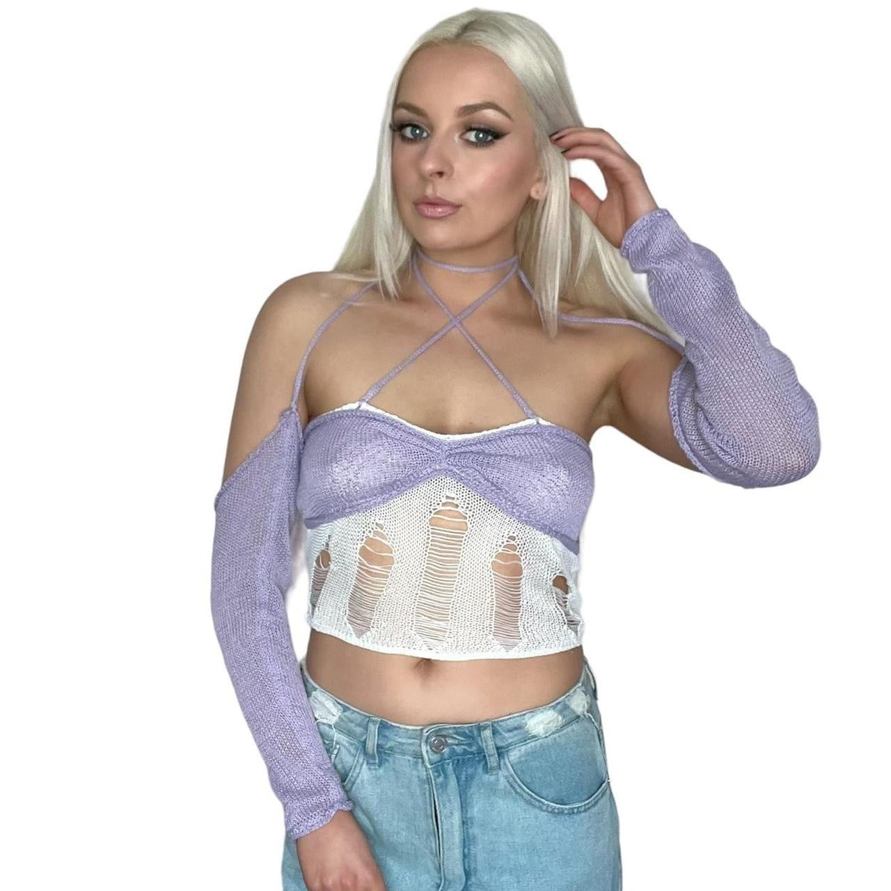 Show off your handmade style with this on-trend Purple and White 2 in 1 Crochet Knitted Crop Top. It's the perfect go-to for evenings out, with a beautiful Halterneck crop top that comes with detachable long sleeves - you'll be ready for whatever the night brings. Boho vibes and cozy comfort are guaranteed!